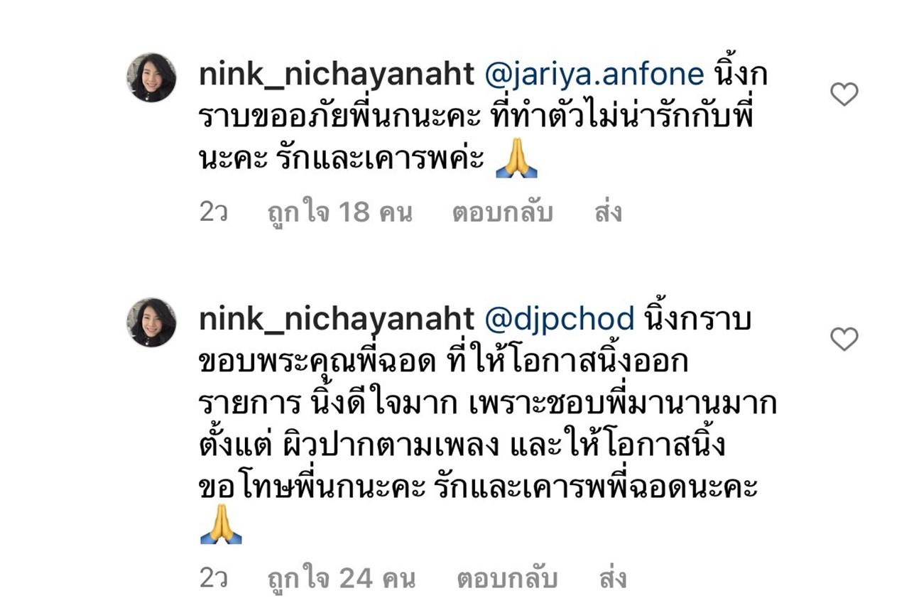 และจากที่ นก จริยา เขามาคอมเมนต์ข้อความดังกล่าวไปพี่ฉอดก็ได้เข้ามาคอมเมนต์ทันทีว่า "เดี๋ยวพี่ขออนุญาตส่งให้น้องนิ้งนะคะ น้องติดค้างใจเรื่องนี้ จนอยากขอโทษในรายการ ดีใจที่ตอบกลับมา ขอบคุณมากๆ จ้า"