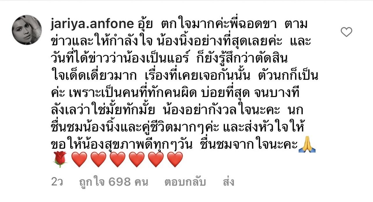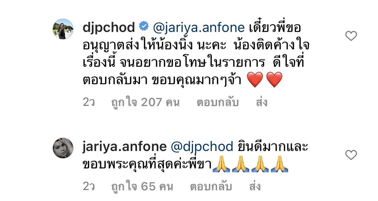 หลังจากที่เป็นกระแสข่าวออกไป ล่าสุด นก จริยา ก็ได้เข้ามาคอมเมนต์ในอินสตาแกรมของ ดีเจพี่ฉอด สายทิพย์ ทันที โดยมีข้อความว่า