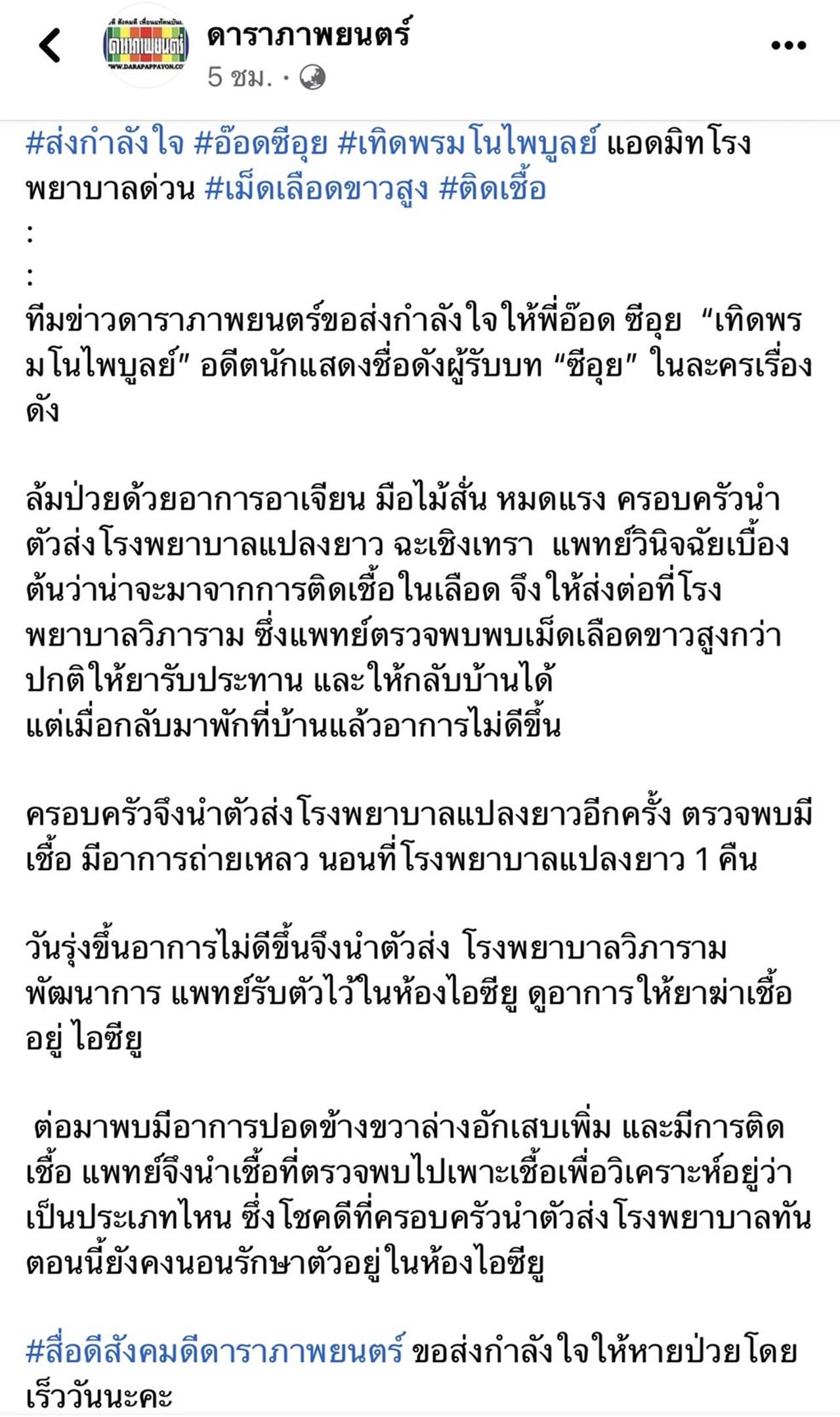 "ขอส่งกำลังใจให้พี่อ๊อด ซีอุย เทิดพร มโนไพบูลย์ อดีตนักแสดงชื่อดังผู้รับบท ซีอุย ในละครเรื่องดัง ล้มป่วยด้วยอาการอาเจียน มือไม้สั่น หมดแรง ครอบครัวนำตัวส่งโรงพยาบาลแปลงยาว ฉะเชิงเทรา แพทย์วินิจฉัยเบื้องต้นว่าน่าจะมาจากการติดเชื้อในเลือด จึงให้ส่งต่อที่โรงพยาบาลวิภาราม