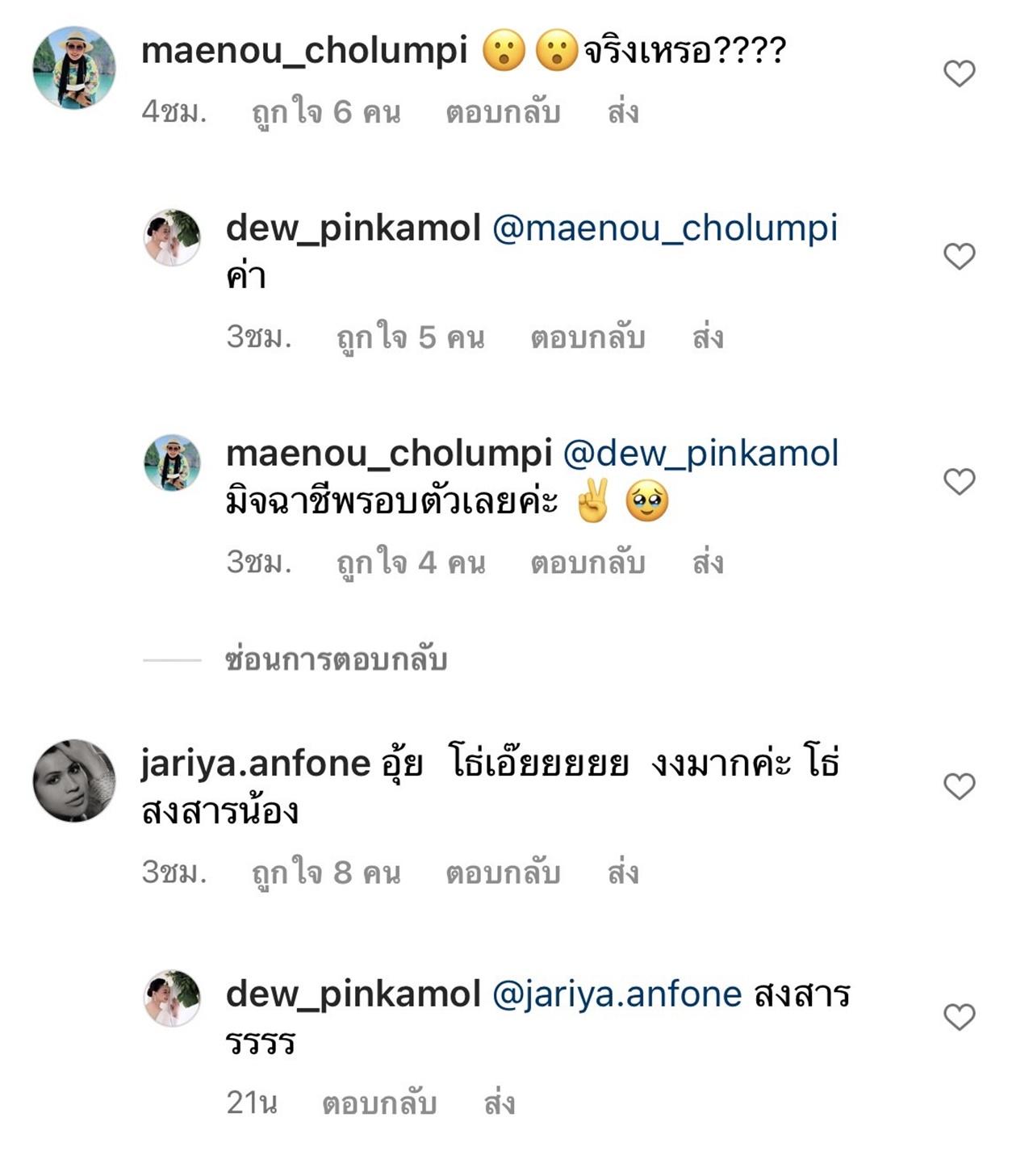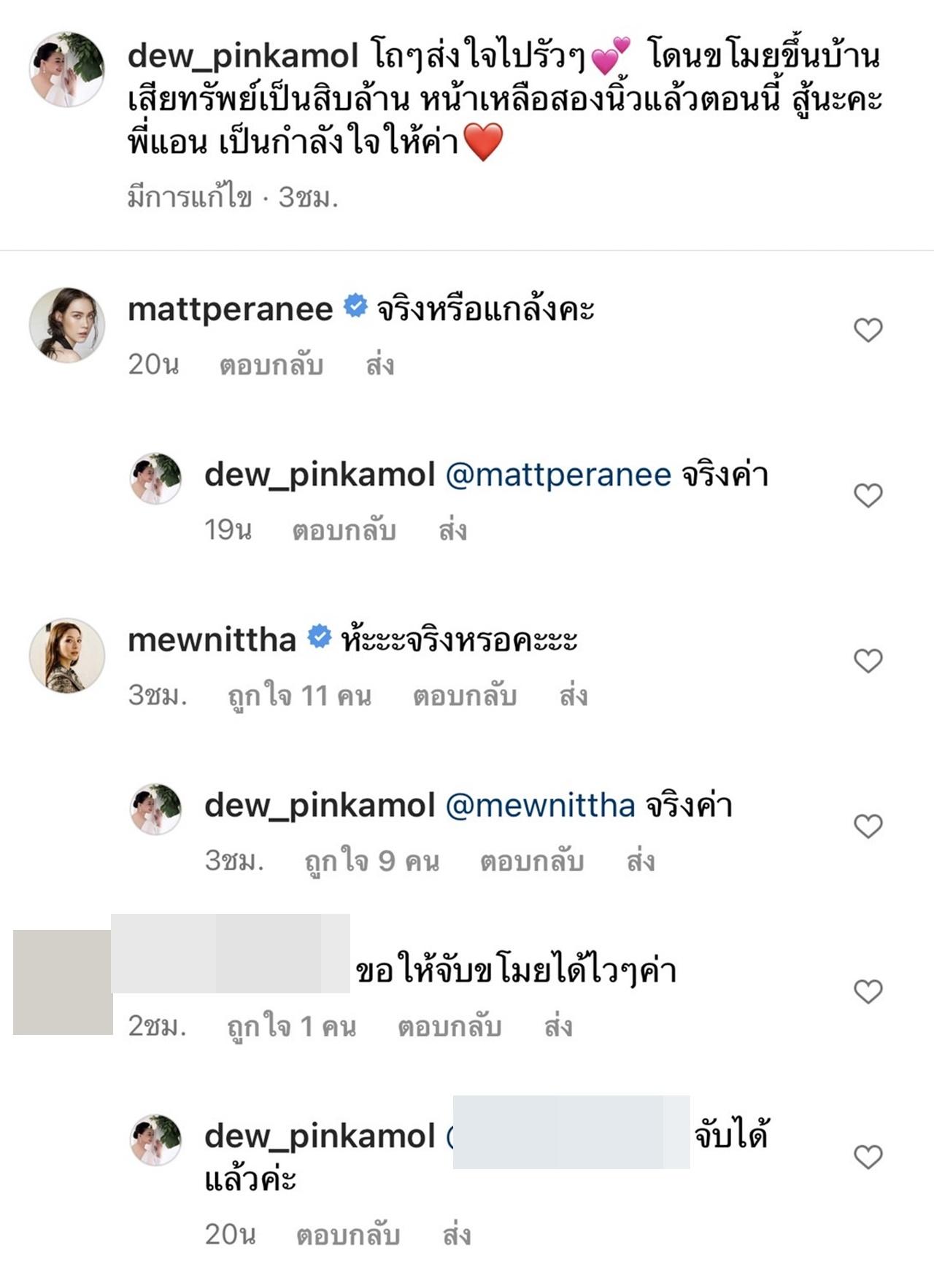 หลังจากนั้น 2 นางเอกสาว แมท ภีรนีย์ และ มิว นิษฐา ก็ได้เข้ามาถามว่าเป็นเรื่องจริงหรือ ซึ่ง ดิว ปิ่นกมล ก็ยืนยันว่าเรื่องที่โพสต์นั้นเป็นเรื่องจริง พร้อมกับแจ้งข่าวเพิ่มว่าตอนนี้สามารถจับคนร้ายได้แล้วด้วย.