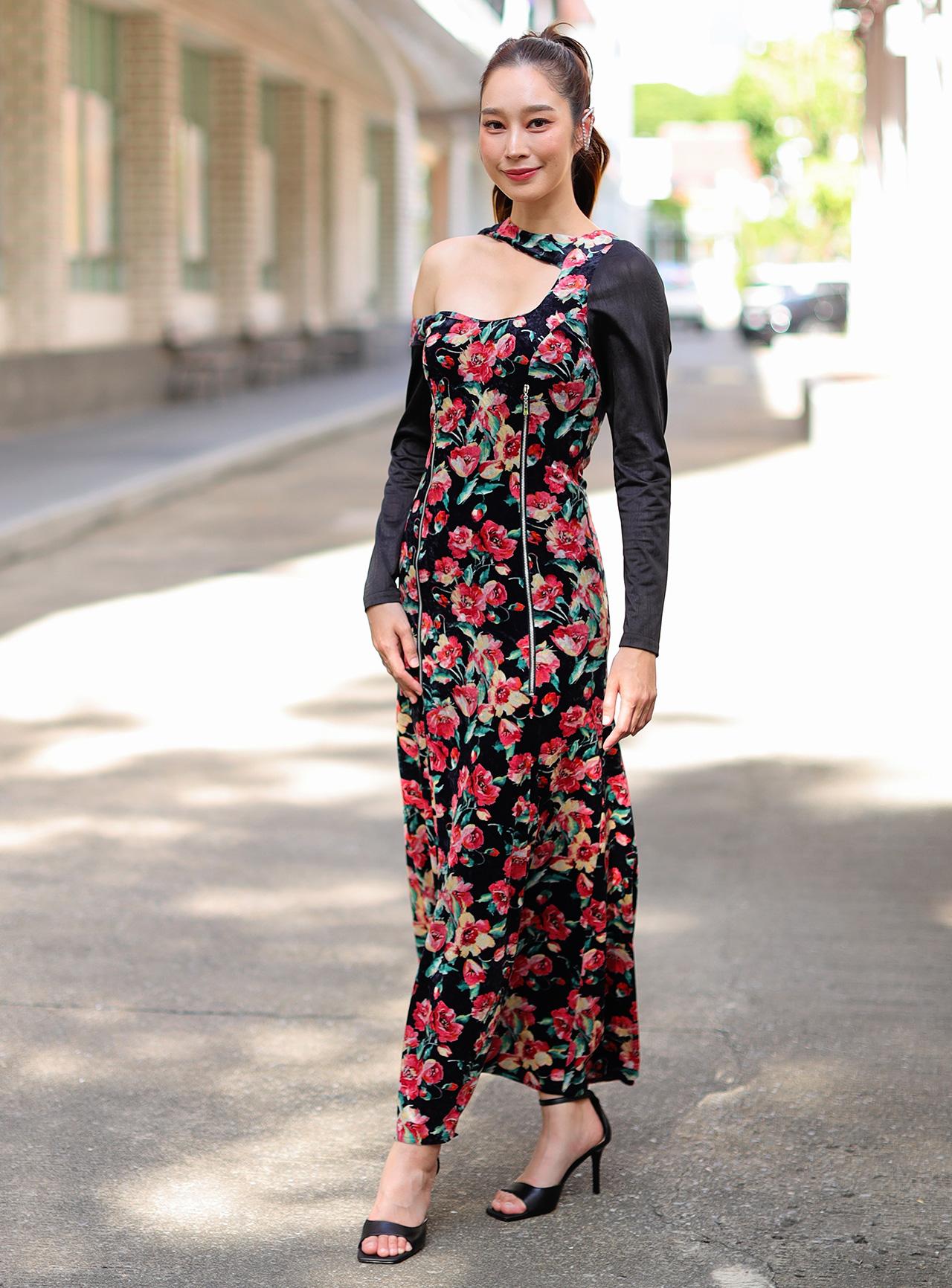 “ตั้งใจอยากให้เห็นความหลากหลายค่ะ ทั้ง 3 ลุคจะต่างกัน เริ่มจากลุคแรกที่ดูสตรีทหน่อย เป็นเสื้อคอร์เซตกับกางเกงขาสั้น และมีแจ็กเกตคลุม ลุคนี้สำหรับฐิสาต้องบอกว่าค่อนข้างใกล้ตัวนะคะ คือปกติเวลาเราใช้ชีวิตประจำวันจะเป็นคนแต่งตัวง่ายๆ ชิลล์ๆ จะไม่ค่อยหวือหวามาก อาจจะออกแนวเท่ๆนิดหนึ่ง ปกติจะใส่กางเกงยีนส์ เสื้อเชิ้ต หรือเสื้อยืดค่ะ”