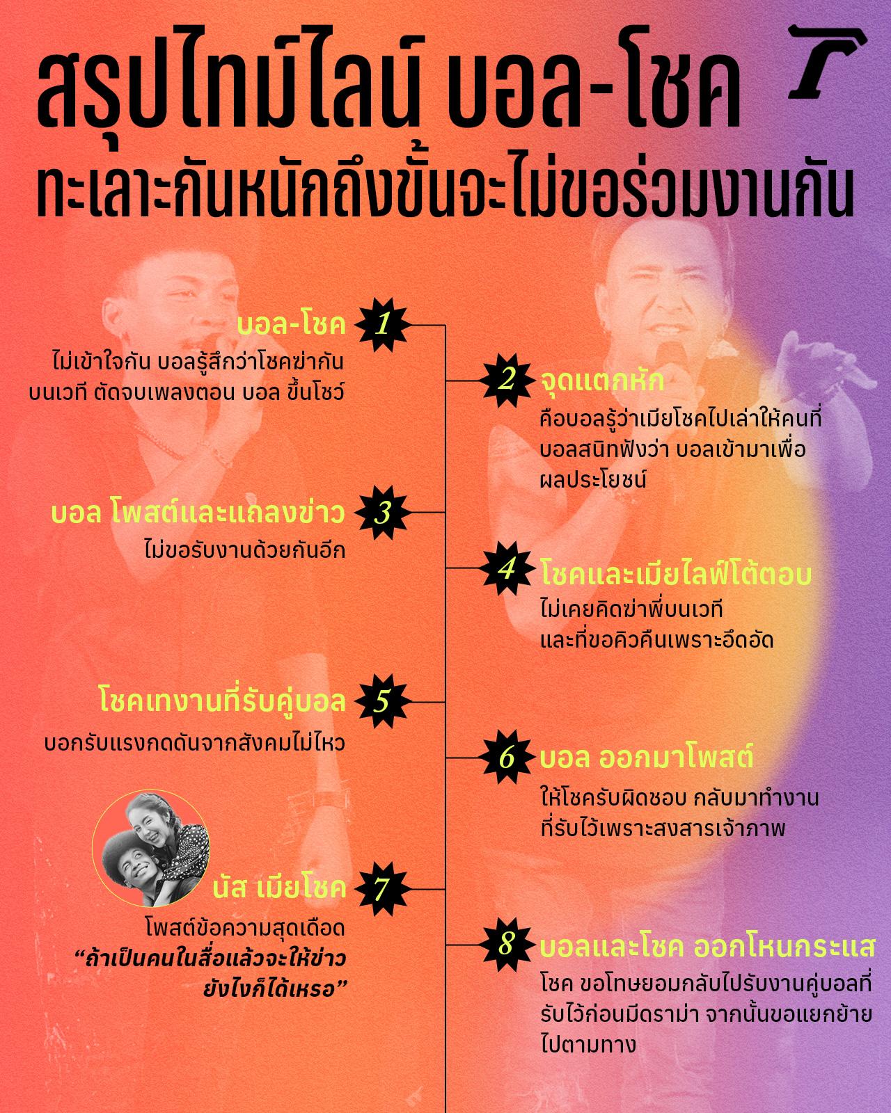 - ล่าสุด บอล พร้อมผู้จัดการ และโชค นัส ได้มานั่งเคลียร์ใจกันในรายการโหนกระแสเป็นเวลา 2 ชั่วโมง ก่อนที่โชคจะยอมกลับไปรับงานจ้าง 50 คิวให้จบเรียบร้อยก่อนแยกย้ายไปทำงานของตัวเอง
