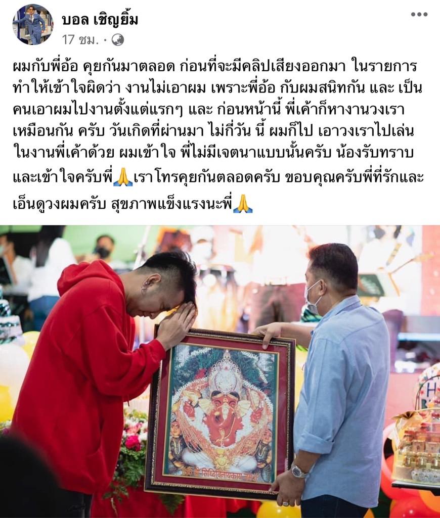 ล่าสุด บอล เชิญยิ้ม ได้โพสต์ถึงคนในคลิปเสียงลงในเฟซบุ๊กส่วนตัวว่า "ผมกับพี่อ้อคุยกันมาตลอด ก่อนที่จะมีคลิปเสียงออกมาในรายการ ทำให้เข้าใจผิดว่างานไม่เอาผม เพราะพี่อ้อกับผมสนิทกัน และเป็นคนเอาผมไปงานตั้งแต่แรกๆ