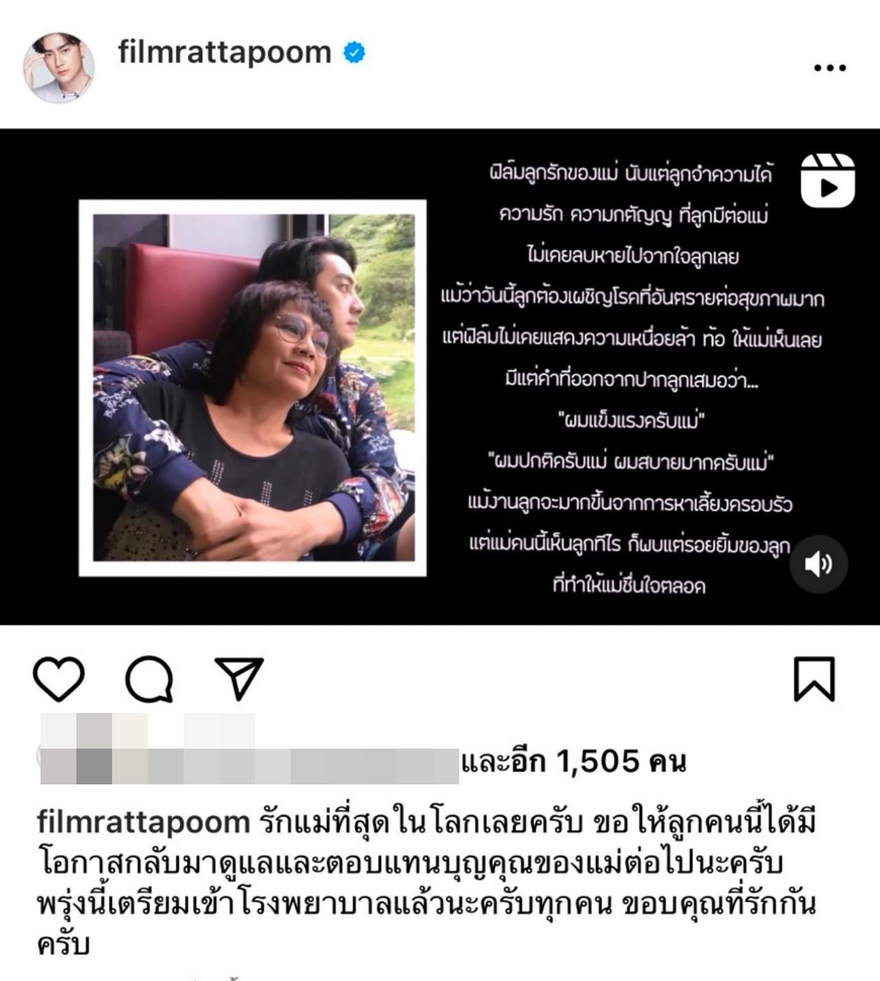 "คุณแม่ขออวยพรให้น้องฟิล์ม มีสุขภาพที่แข็งแรง แคล้วคลาดปลอดภัยจากการผ่าตัดวันที่ 9 นี้นะคะ ขอเป็นกำลังใจให้ค่ะ รักลูกที่สุดเลยค่ะ" ด้านแฟนๆ ที่ติดตามต่างเข้ามาส่งกำลังใจให้ ฟิล์ม กันเป็นจำนวนมาก.