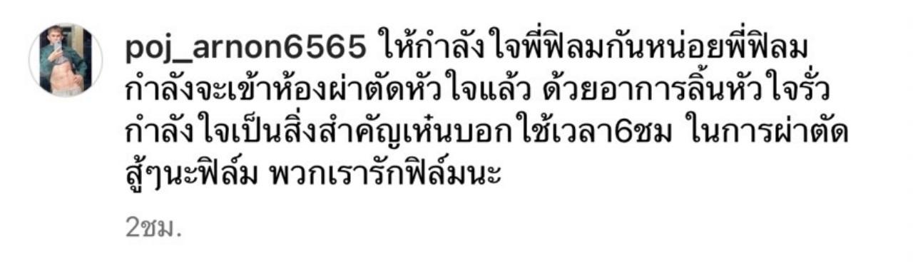 และ พชร์ ได้เขียนแคปชั่นว่า "ให้กำลังใจพี่ฟิลมกันหน่อยพี่ฟิล์มกำลังจะเข้าห้องผ่าตัดหัวใจแล้ว ด้วยอาการลิ้นหัวใจรั่ว กำลังใจเป็นสิ่งสำคัญเห็นบอกใช้เวลา 6 ชม. ในการผ่าตัด สู้ๆ นะฟิล์ม พวกเรารักฟิล์มนะ".
