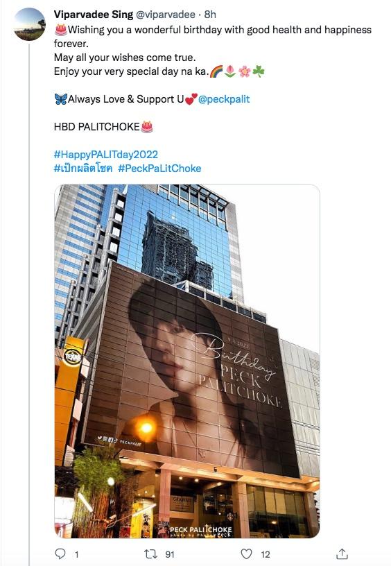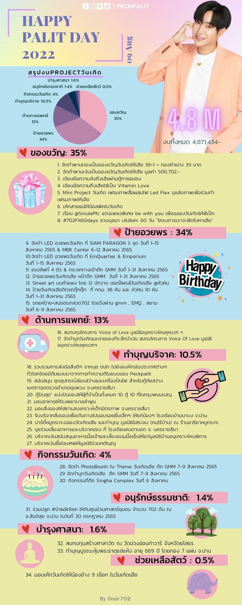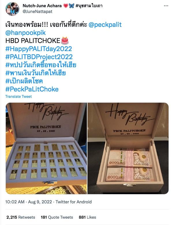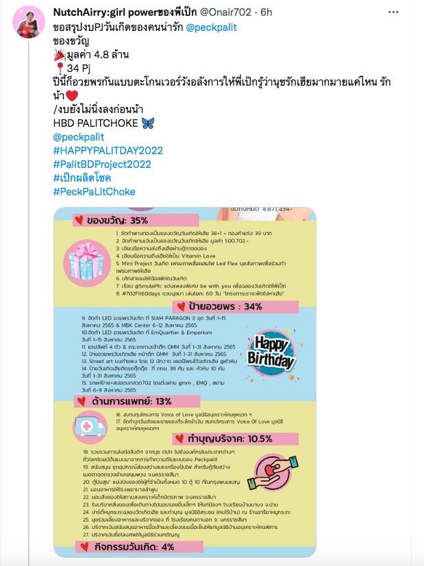 ซึ่งนอกจากแฟนๆ จะโพสต์ข้อความอวยพรวันเกิดนักร้องหนุ่ม พร้อมทั้งติดแฮชแท็ก #HappyPALITday2022 จนติดเทรนด์ทวิตเตอร์แล้ว ยังมีผู้ใช้ทวิตเตอร์รายหนึ่งได้สรุปงบการทำโปรเจกต์วันเกิดเป็นจำนวนสูงถึง 4,871,434 บาท ซึ่งโปรเจกต์ดังกล่าวมีรายละเอียดดังนี้