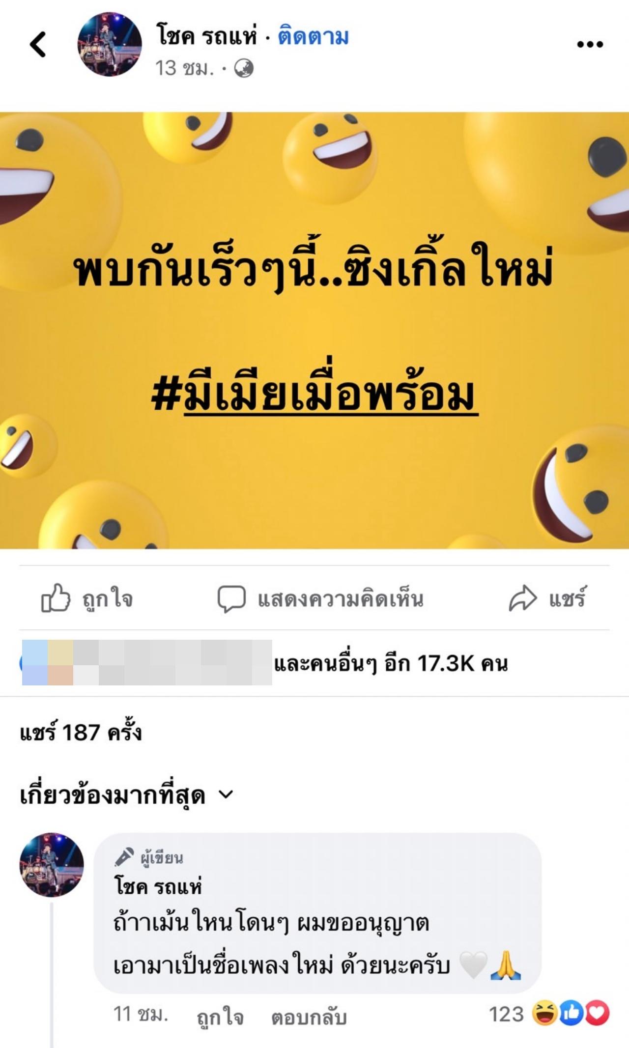 ล่าสุด โชค รถแห่ ได้โพสต์ข้อความผ่านแฟนเพจของตัวเอง โดยบอกว่า "พบกันเร็วๆ นี้..ซิงเกิลใหม่ #มีเมียเมื่อพร้อม" พร้อมยังบอกต่อว่า "ถ้าเมนต์ไหนโดนๆ ผมขออนุญาตเอามาเป็นชื่อเพลงใหม่ด้วยนะครับ" และ "ล่าสุด จะทำเพิ่มอีกเพลง!! #รักผัวจนทัวร์ลง"