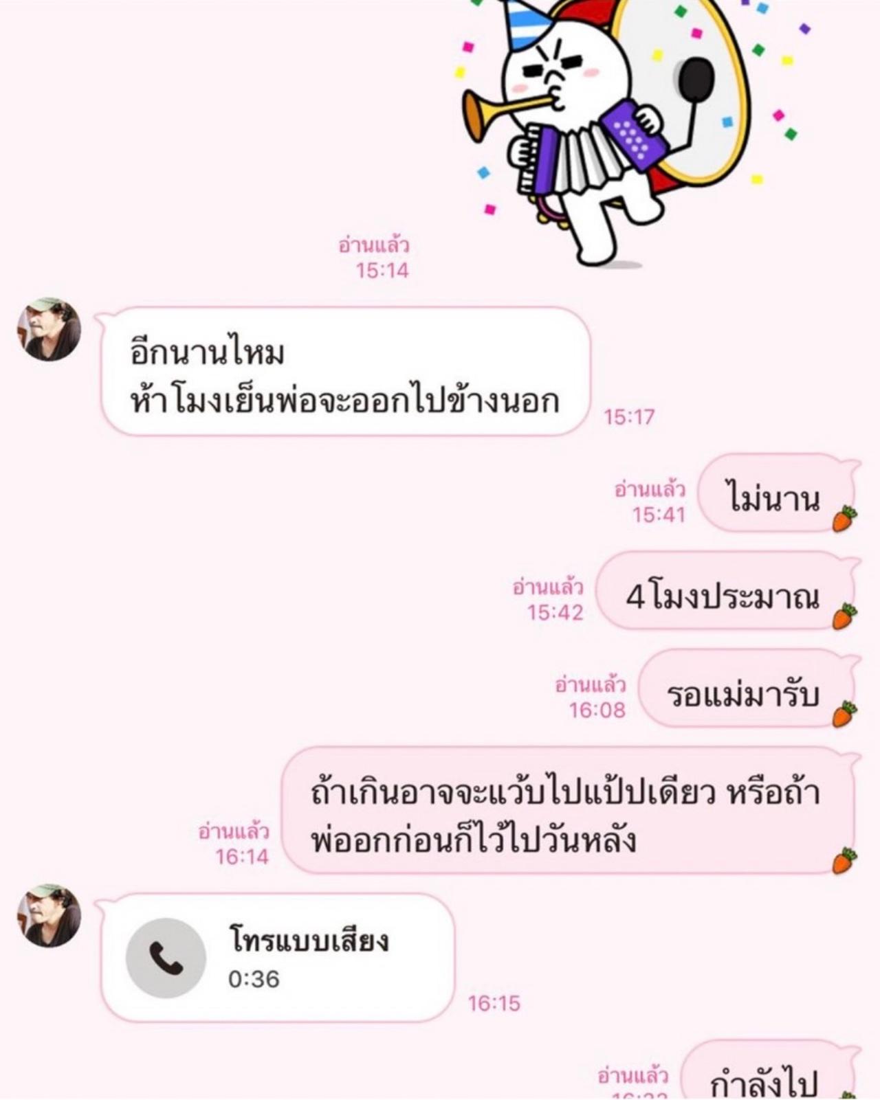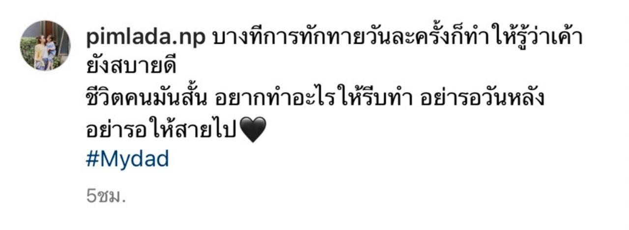 "บางทีการทักทายวันละครั้งก็ทำให้รู้ว่าเค้ายังสบายดี ชีวิตคนมันสั้น อยากทำอะไรให้รีบทำ อย่ารอวันหลัง อย่ารอให้สายไป #Mydad"