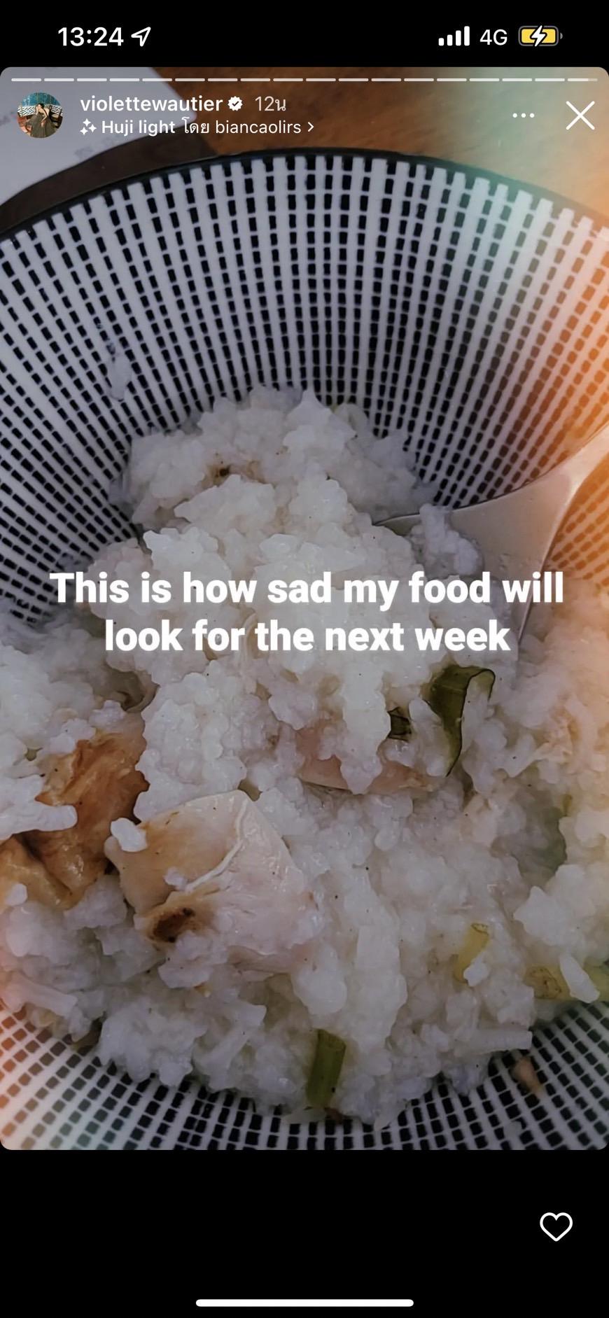 นอกจากนี้ยังโดนคุณหมอสั่งห้ามกินอาหารอีกหลายอย่าง ทั้งมีการให้งดอาหารเผ็ดรสจัด รวมไปถึงของทอดของมัน ขนาดน้ำส้มยังถูกห้าม เพราะมันเป็นกรดอีกด้วย อาหารที่เธอทานล่าสุดก็คือข้าวต้มอ่อนๆ ที่สามารถกลืนได้ง่าย ไม่กระทบต่อเส้นเสียงและลำคอ