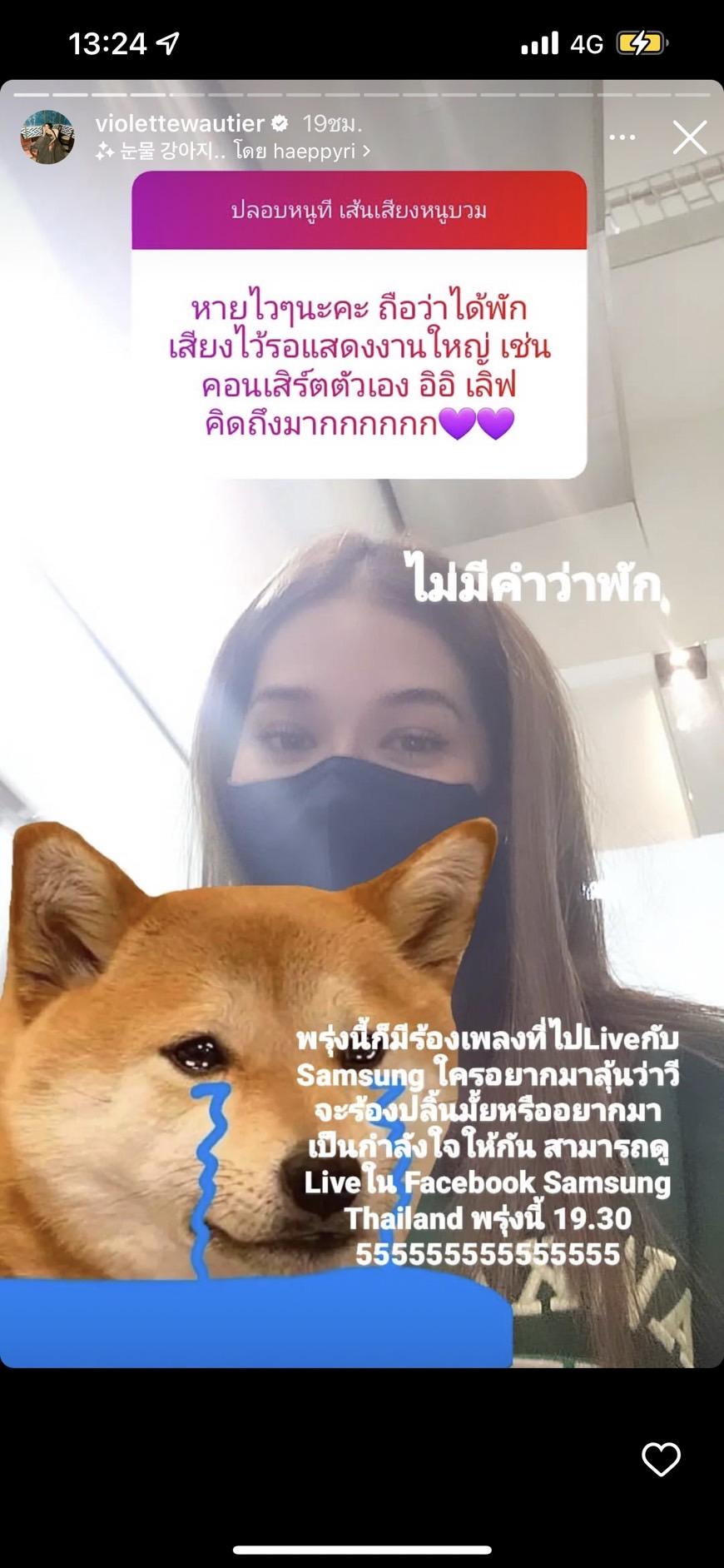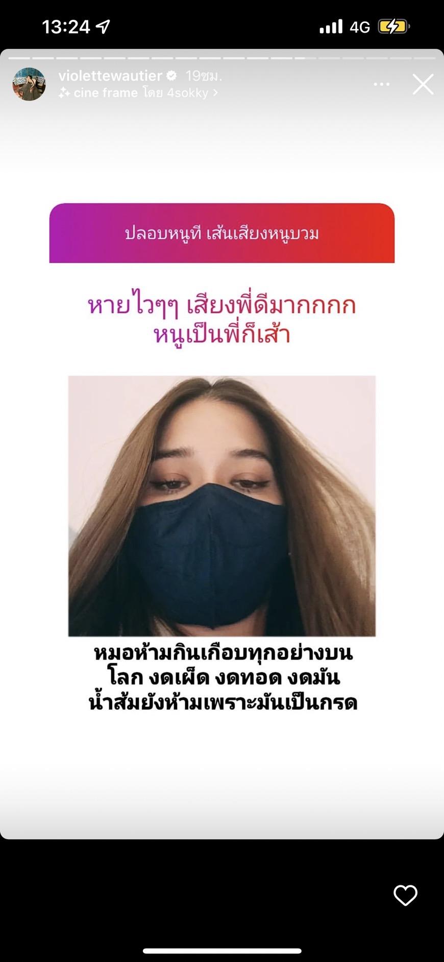 ซึ่งเธอได้โพสต์ไอจีสตอรี่อัปเดตถึงสาเหตุการป่วยครั้งนี้มาจาก "เส้นเสียงบวม เพราะอาทิตย์ที่ผ่านมาเธอใช้เส้นเสียงเยอะ และใช้เสียงแบบผิดวิธี แล้วฝืนไปหน่อย และคุณหมอก็ทำการฉีดยาให้ 2 เข็ม พร้อมกับจัดยาชุดใหญ่ให้ 6 ตัว"