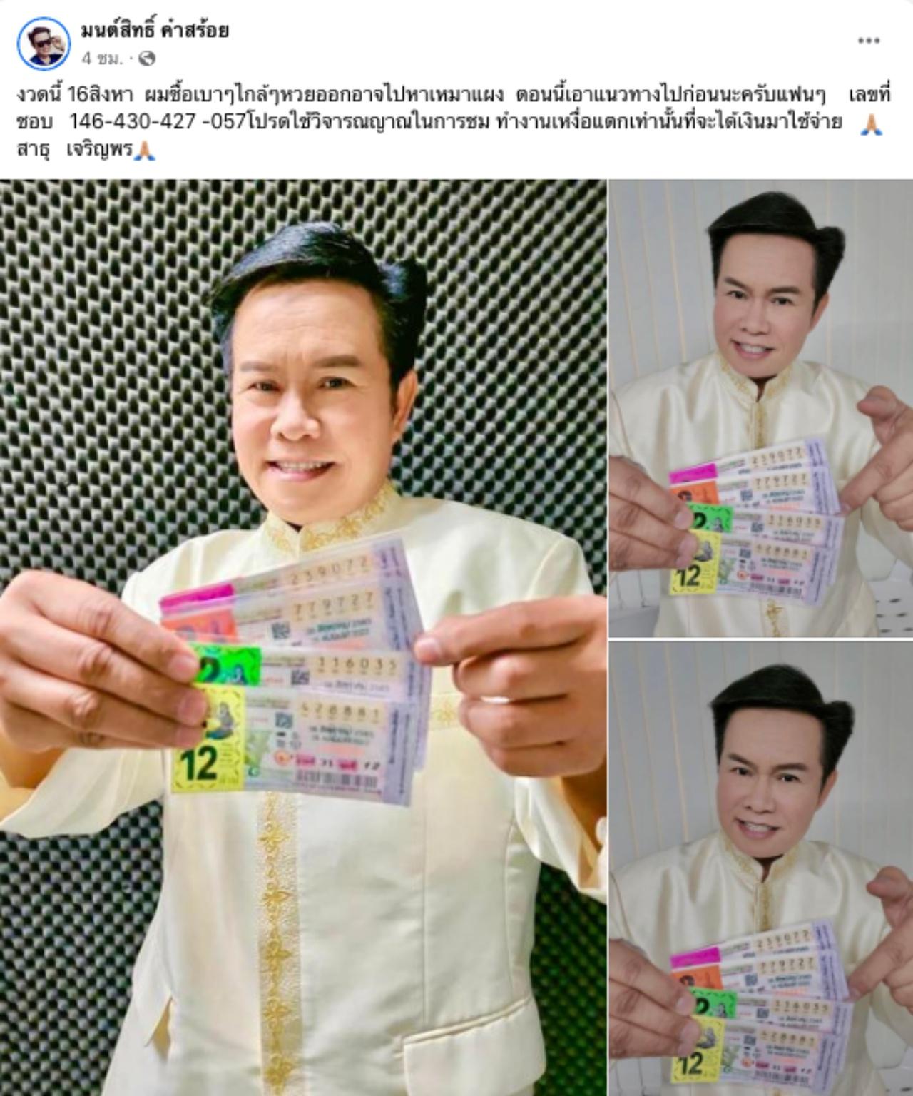 โดย หวยมนต์สิทธิ์ งวดนี้เจ้าตัวได้โพสต์ว่า "งวดนี้ 16 สิงหา ผมซื้อเบาๆ ใกล้ๆ หวยออกอาจไปหาเหมาแผง ตอนนี้เอาแนวทางไปก่อนนะครับแฟนๆ เลขที่ชอบ 146-430-427-057 โปรดใช้วิจารณญาณในการชม ทำงานเหงื่อแตกเท่านั้นที่จะได้เงินมาใช้จ่าย สาธุ เจริญพร" เอ้าใครจะใช้เป็นแนวทางเดินตามรอย มนต์สิทธิ์ คำสร้อย ก็เชิญตามสะดวกจ้า.