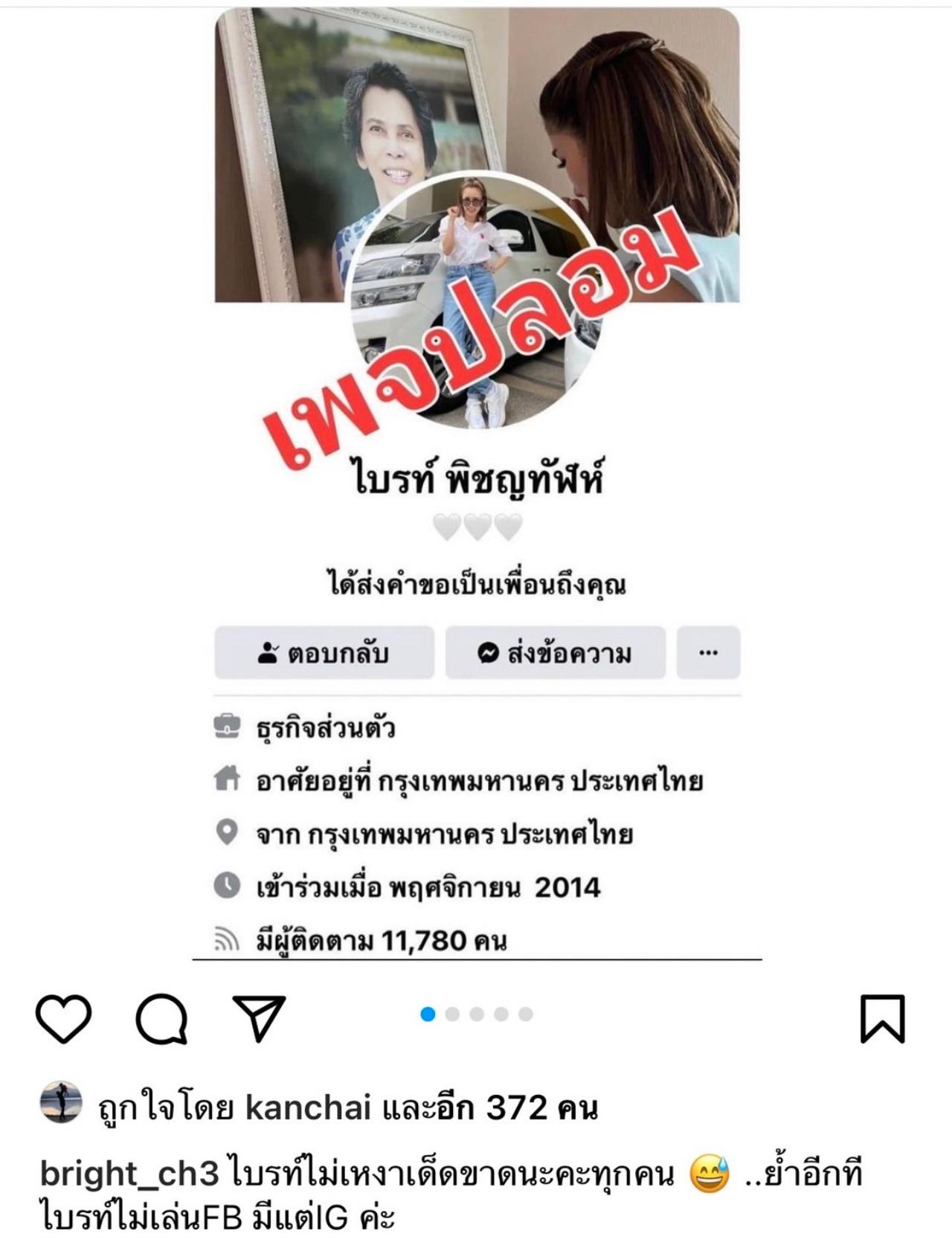 โดย ไบรท์ ได้แจ้งข่าวนี้ผ่านทางอินสตาแกรมของตัวเองด้วยการแคปภาพหน้าเฟซบุ๊กดังกล่าว และเขียนแคปชั่นเอาไว้ว่า "ไบรท์ไม่เหงาเด็ดขาดนะคะทุกคน ..ย้ำอีกทีไบรท์ไม่เล่นFB มีแต่IG ค่ะ"