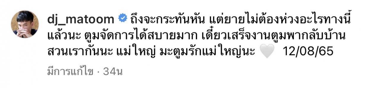 โดยล่าสุด มะตูม ได้โพสต์อินสตาแกรมส่วนตัวเพื่อแจ้งข่าวการจากไปของคุณยาย ด้วยการลงภาพแสดงการไว้อาลัยให้กับแม่ใหญ่ พร้อมระบุข้อความว่า "ถึงจะกระทันหัน แต่ยายไม่ต้องห่วงอะไรทางนี้แล้วนะ ตูมจัดการได้สบายมาก เดี๋ยวเสร็จงานตูมพากลับบ้านสวนเรากันนะ แม่ใหญ่ มะตูมรักแม่ใหญ่นะ 12/08/65"