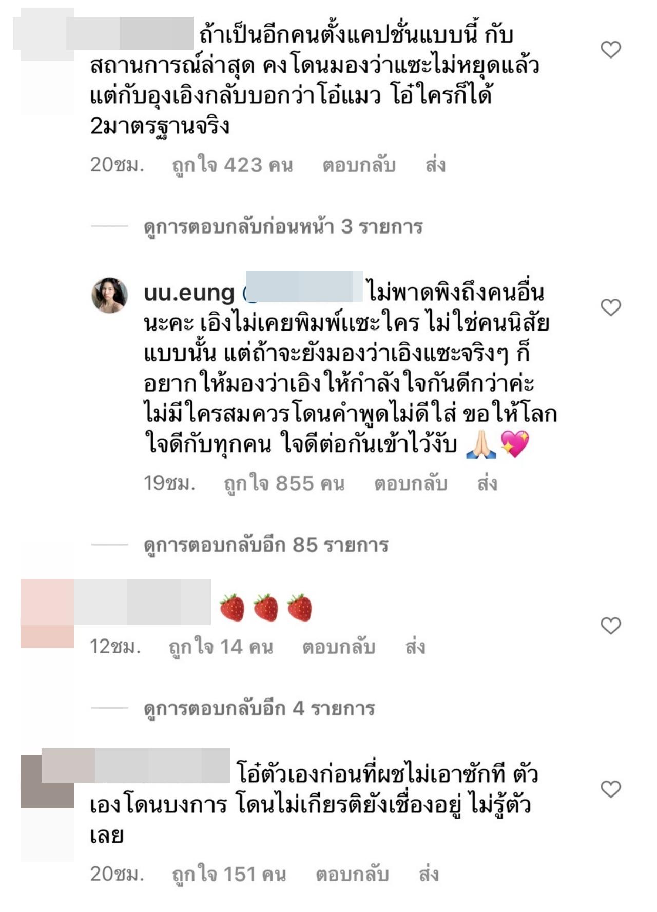 โอ๋ใครอ่า 55555, โอ๋ๆ ได้ตรงจังหวะมากเลยค่ะ, บอกใครหรือเปล่า?, ถ้าเป็นอีกคนตั้งแคปชั่นแบบนี้ กับสถานการณ์ล่าสุด คงโดนมองว่าแซะไม่หยุดแล้ว แต่กับอุงเอิงกลับบอกว่าโอ๋แมว โอ๋ใครก็ได้ 2 มาตรฐาน"