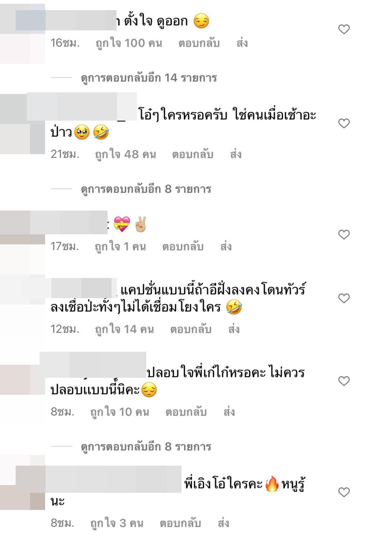 จนทำให้มีชาวเน็ตเข้ามาคอมเมนต์ถามและบางคอมเมนต์ก็ตำหนิ อุงเอิง ว่า "โอ๋ๆ ใครเหรอครับ ใช่คนเมื่อเช้าอะป่าว, ปลอบใจพี่เก๋เหรอคะ ไม่ควรปลอบแบบนี้นิคะ, พี่เอิงโอ๋ใครคะ หนูรู้นะ, ตั้งใจ ดูออก, บังเอิญได้ตรงเวลาแบบนี้แหละถึงดราม่าไม่จบ, แคปชั่นมีเยอะแยะ พี่เอิง,
