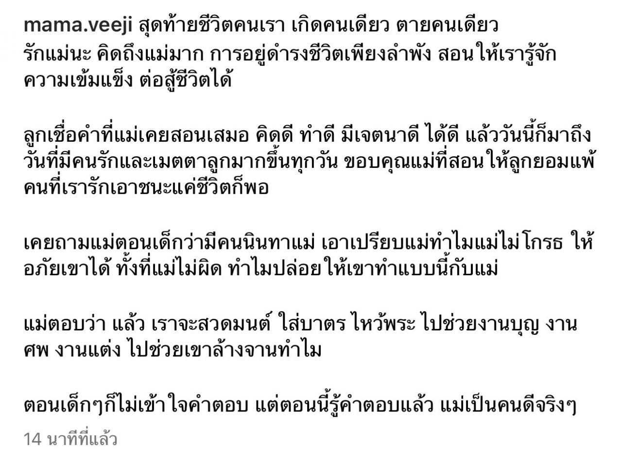 ที่ล่าสุดโพสต์คลิปตัวเองในขณะที่นั่งมองรูปแม่ที่จากไปแล้ว พร้อมกับเขียนแคปชั่นซึ้งๆ เอาไว้ว่า