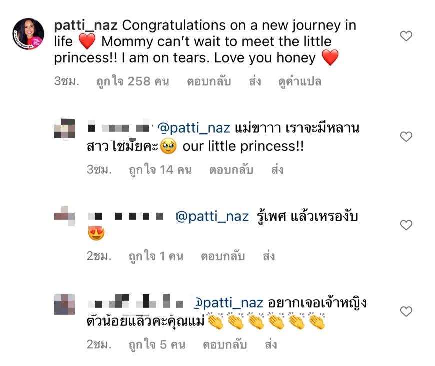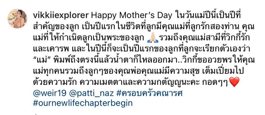 ด้านคุณแม่สามี พลอยไพลิน ก็ดูทีท่าว่าจะเห่อหลานคนแรกไม่เบาเช่นกัน ถึงกับโผล่เข้ามาคอมเมนต์แสดงความยินดีใต้รูปที่ลูกสะใภ้ วิกกี้ ได้โพสต์เอาไว้ โดยข้อความดังกล่าวได้ระบุเอาไว้เป็นภาษาอังกฤษว่า