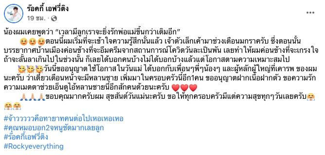 โดยหนุ่ม ร๊อคกี้ ออกมาโพสต์ข้อความสุดซึ้งผ่านทางเฟซบุ๊กส่วนตัวว่า "น้องผมเคยพูดว่า เวลามีลูกเราจะยิ่งรักพ่อแม่ขึ้นกว่าเดิมอีก ตอนนี้ผมเริ่มที่จะเข้าใจความรู้สึกนั้นแล้ว เจ้าตัวเล็กเค้ามาช่วงเดือนมกราครับ