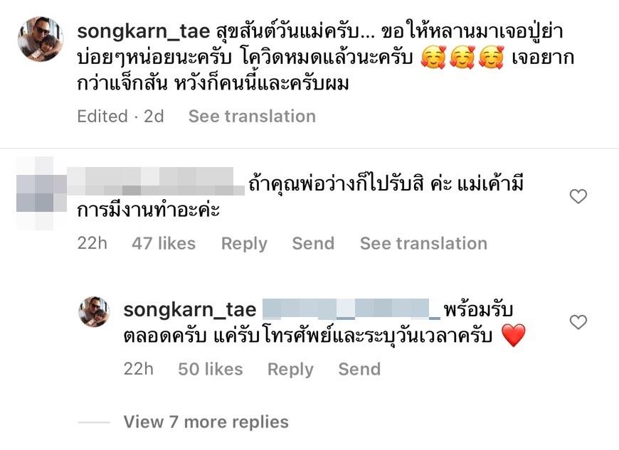 นอกจากนี้ยังมีคอมเมนต์หนึ่งที่แสดงความคิดเห็นว่า “ถ้าคุณพ่อว่างก็ไปรับสิคะ แม่เค้ามีการมีงานทำอะค่ะ” และสงกรานต์ก็ตอบกลับไปว่า “พร้อมรับตลอดครับ แค่รับโทรศัพท์และระบุวันเวลาครับ”.