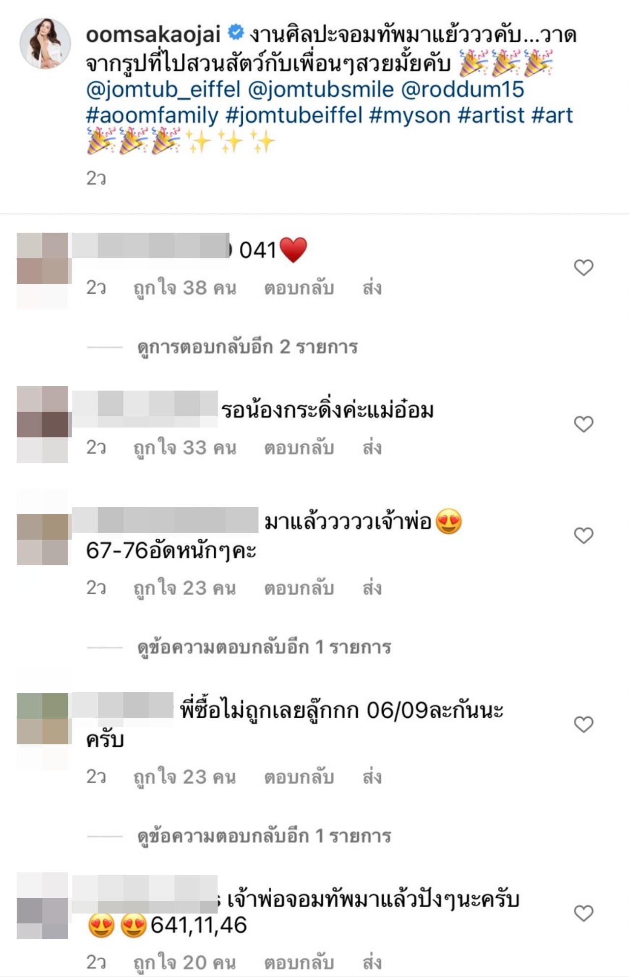 และก่อนหน้านี้ อ๋อม ก็ยังได้โพสสต์ภาพวาดศิลปะฝีมือจาก น้องจอมทัพ ลูกชาย ด้านแฟนๆ ก็ได้เข้ามาคอมเมนต์เกี่ยวกับตัวเลขกันเป็นจำนวนมาก อาทิ 041, มาแล้วววววเจ้าพ่อ 67-76 อัดหนักๆ ค่ะ, เจ้าพ่อจอมทัพมาแล้วปังๆ นะครับ 641, 11, 46, 41, 14 ปังๆ นะค่า.