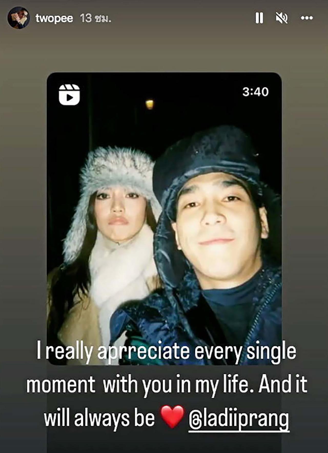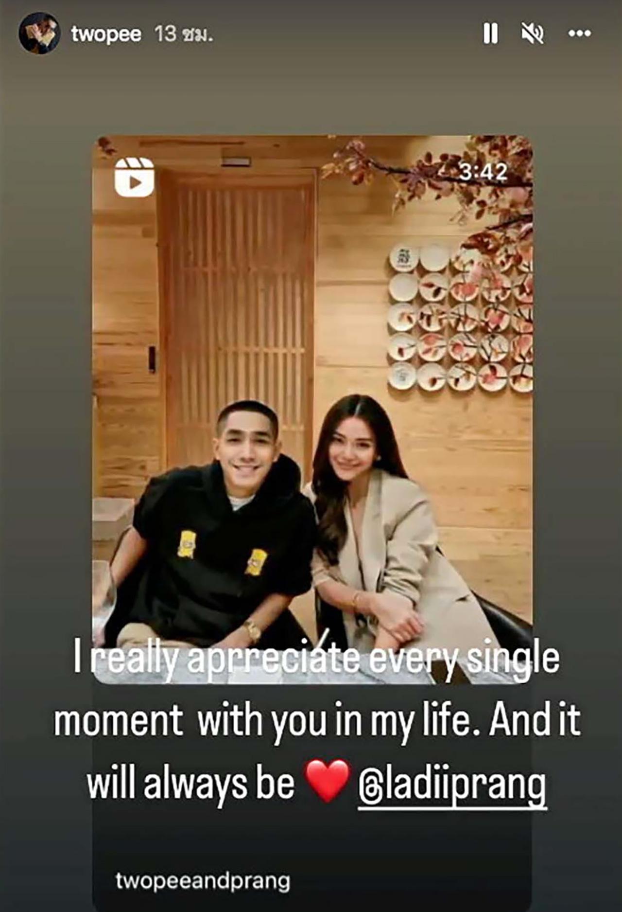 ล่าสุด ได้โพสต์สตอรีซึ่งคราวนี้ติดแท็กถึงสาว ปราง ด้วย เอาแบบชัดๆ ไปเลย โดยเป็นภาพและคลิปหวานๆ ในวันวานของทั้งสองคน พร้อมกับข้อความภาษาอังกฤษแปลไทยได้ว่า “ฉันมีความสุขทุกช่วงเวลาที่ได้ใช้กับคุณในชีวิตของฉัน และมันจะเป็นเช่นนี้เสมอ @ladiiprang” โดยข้อความดังกล่าวหลายคนเชื่อว่าน่าจะเป็นการพร่ำพรรณนาบอกลาคนรัก และความสุขที่ผ่านมาจะขอเก็บไว้ในความทรงจำ... หลายสิ่งหลายเรื่องต่างก็ชี้ไปในทางร้ายมากกว่าดี ที่เหลือก็รอเพียงฝ่ายใดฝ่ายหนึ่งจะออกมาบอกกล่าวอย่างเป็นทางการเท่านั้น ว่าความสัมพันธ์ของทั้งสองจะได้ไปต่อ หรือจบลงแต่เพียงนี้จริงๆ.