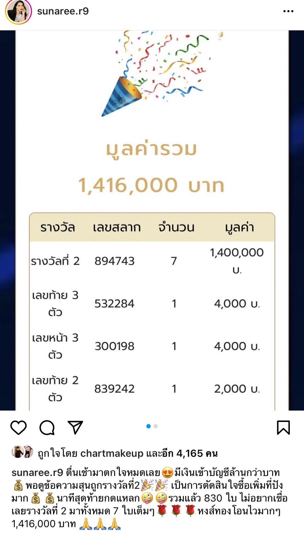 พร้อมกับโพสต์ภาพพร้อมระบุข้อความลงอินสตาแกรมส่วนตัวว่า "ตื่นเช้ามาตกใจหมดเลย มีเงินเข้าบัญชีล้านกว่าบาท พอดูข้อความสุนถูกรางวัลที่ 2 เป็นการตัดสินใจซื้อเพิ่มที่ปังมาก นาทีสุดท้ายกดแหลก รวมแล้ว 830 ใบ ไม่อยากเชื่อเลยรางวัลที่ 2 มาทั้งหมด 7 ใบเต็มๆ ซื้อออนไลน์โอนไวมากๆ 1,416,000 บาท".