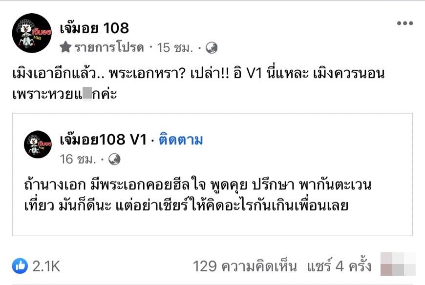 ก่อนจะแชร์ข้อความจากเพจ เจ๊มอย108 V1 ที่บอกว่า “ถ้านางเอก มีพระเอกคอยฮีลใจ พูดคุย ปรึกษา พากันตระเวนเที่ยว มันก็ดีนะ แต่อย่าเชียร์ให้คิดอะไรกันเกินเพื่อนเลย” พร้อมทั้งเขียนข้อความว่า “เมิงเอาอีกแล้ว.. พระเอกหรา? เปล่า!! อิ V1 นี่แหละ เมิงควรนอนเพราะหวยแ-กค่ะ”