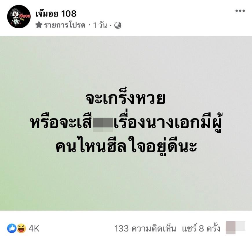 ทำเอาต่อมเผือกของชาวเน็ตเริ่มทำงานอีกแล้ว เมื่อเพจบันเทิงดัง เจ๊มอย 108 โพสต์เม้าท์เปิดประเด็นร้อนเรื่องความรักของนางเอกคนหนึ่ง โดยบอกว่า “จะเกร็งหวยหรือจะเสื--เรื่องนางเอกมีผู้คนไหนฮีลใจอยู่ดีนะ”