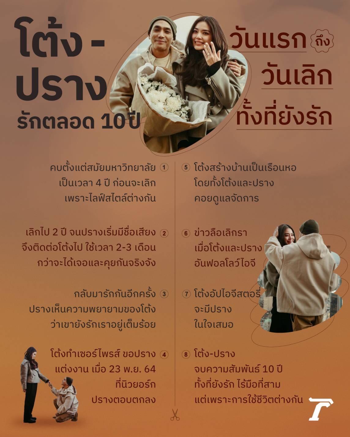 ทั้งคู่ได้คบกันตั้งแต่เรียนมหาวิทยาลัย เป็นเวลา 4 ปี ปรางประทับใจตัวโต้งตั้งแต่วันแรกที่เจอ แต่ด้วยไลฟ์สไตล์ที่ต่างกัน แม้จะปรับจูนมาเรื่อยๆ จึงทำให้ตัดสินใจเลิกกัน