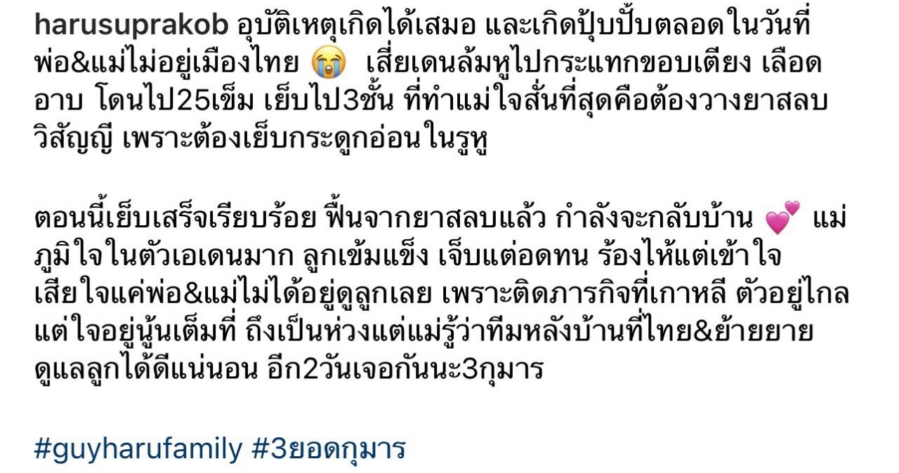 ตอนนี้เย็บเสร็จเรียบร้อย ฟื้นจากยาสลบแล้ว กำลังจะกลับบ้าน แม่ภูมิใจในตัวเอเดนมาก ลูกเข้มแข็ง เจ็บแต่อดทน ร้องไห้แต่เข้าใจ เสียใจแค่พ่อ & แม่ไม่ได้อยู่ดูลูกเลย เพราะติดภารกิจที่เกาหลี ตัวอยู่ไกลแต่ใจอยู่นู้นเต็มที่ ถึงเป็นห่วงแต่แม่รู้ว่าทีมหลังบ้านที่ไทย&ย้ายยายดูแลลูกได้ดีแน่นอน อีก2วันเจอกันนะ3กุมาร #guyharufamily #3ยอดกุมาร".