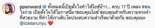 ส่วนสาว เป้ย ก็ได้โพสต์ความในใจถึง ไอซ์ ว่า “ทั้งหมดนี้เป้ยตั้งใจทำให้ไอซ์น้าา… ครบ 17 ปี เพลง #คนใจง่าย เป้ยตั้งใจใช้โอกาสนี้มาขอบคุณไอซ์ ขอบคุณสำหรับความทรงจำที่สวยงาม ที่ทำให้เราเติบโตประสบความสำเร็จมาด้วยกัน ขอบคุณนะ @icesarunyu”.