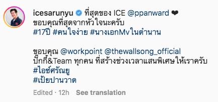 ซึ่งหลังจบรายการหนุ่ม ไอซ์ ยังได้โพสต์ความรู้สึกลงบนอินสตาแกรมส่วนตัวว่า “ที่สุดของ ICE @ppanward ขอบคุณที่สุดจากหัวใจนะครับ #17ปี #คนใจง่าย #นางเอกMvในตำนาน ขอบคุณ @workpoint @thewallsong_official ปั๊กกี้&Team ทุกคน ที่สร้างช่วงเวลาแสนพิเศษให้เราครับ #ไอซ์ศรัณยู #เป้ยปานวาด”