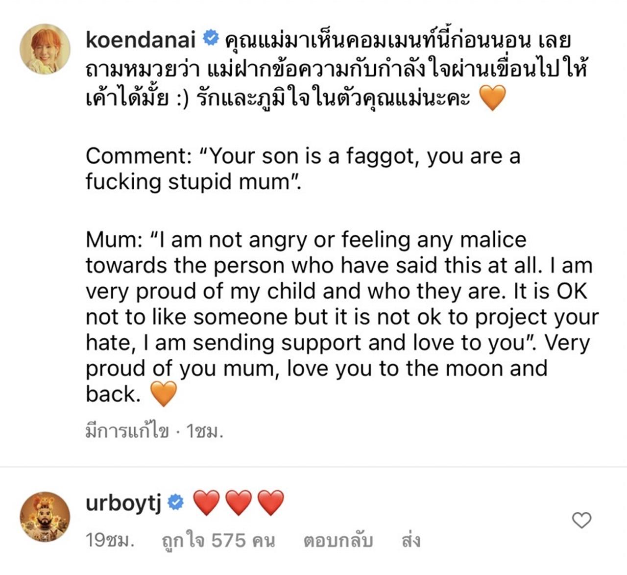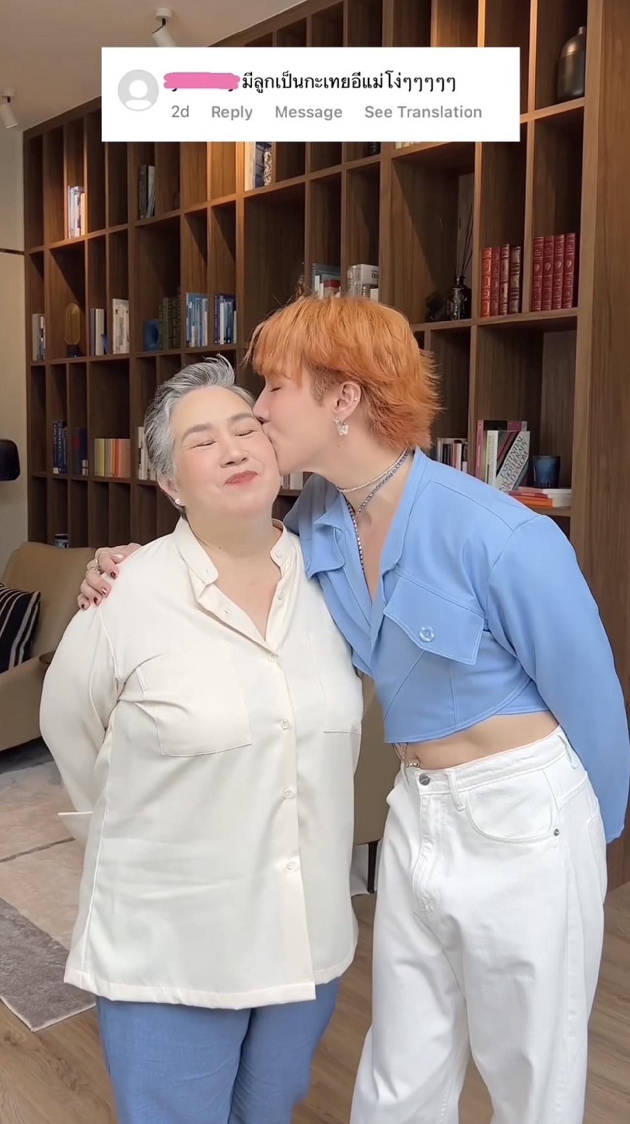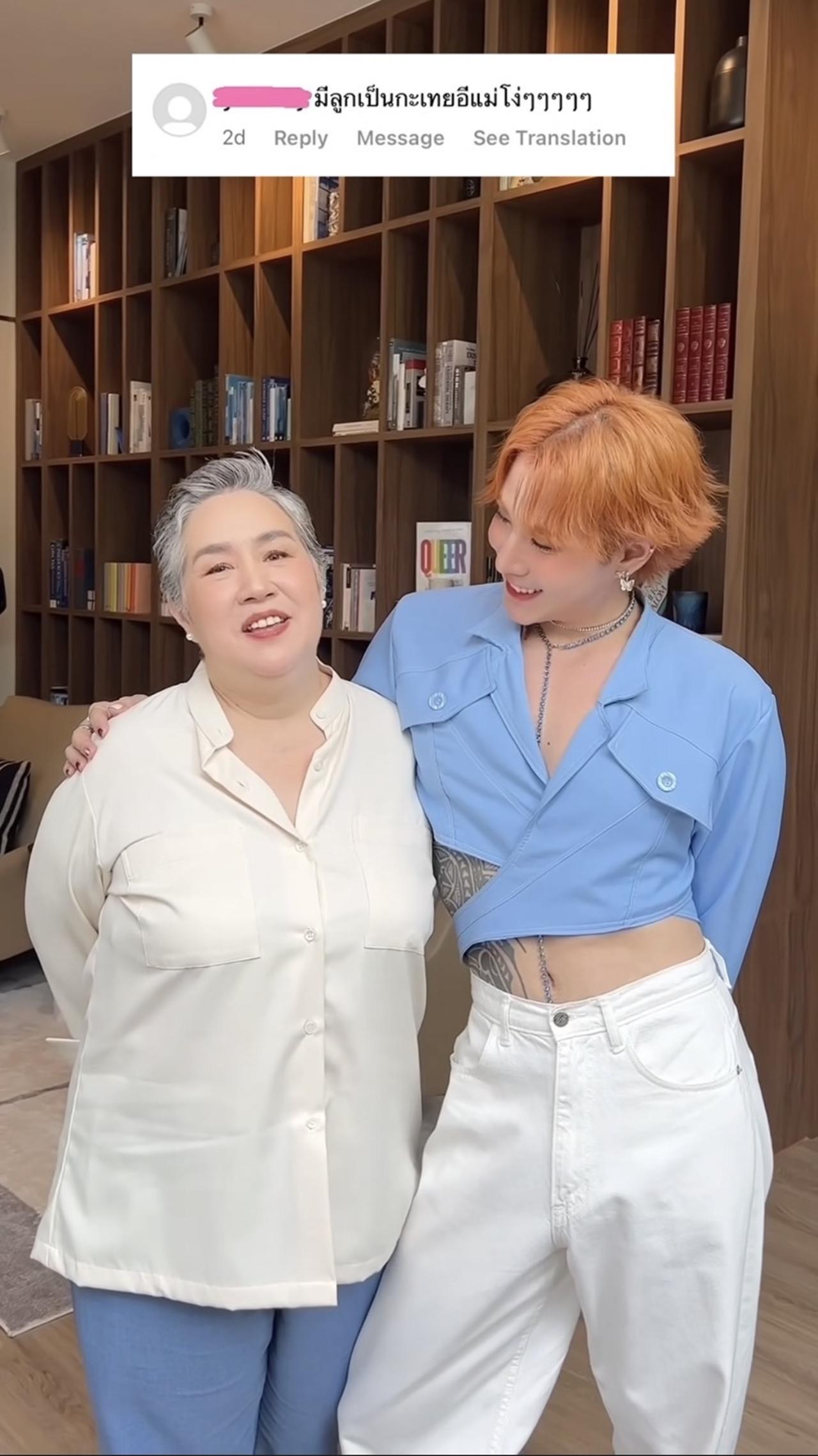 "ตอนแรกที่แม่เห็นคอมเมนต์นี้ถึงกับสะดุ้งเฮือก แต่ไม่ได้โกรธ เพราะแม่มีแต่ความภาคภูมิใจในตัวลูก เพราะฉะนั้นไม่มีอะไรทำให้แม่โกรธได้ อีกอย่างแม่ก็เชื่อว่าคนทุกคนเป็นธรรมดาที่มีทั้งคนชอบและไม่ชอบ แต่ถ้าไม่ชอบกันก็ไม่จำเป็นต้องใช้วาจาทำร้ายกัน และอีกอย่างวาจาไม่ดีที่เราพูดออกมา จะทำให้ตัวเราเองมัวหมอง คุณแม่เป็นกำลังใจและซัพพอร์ตนะคะ"