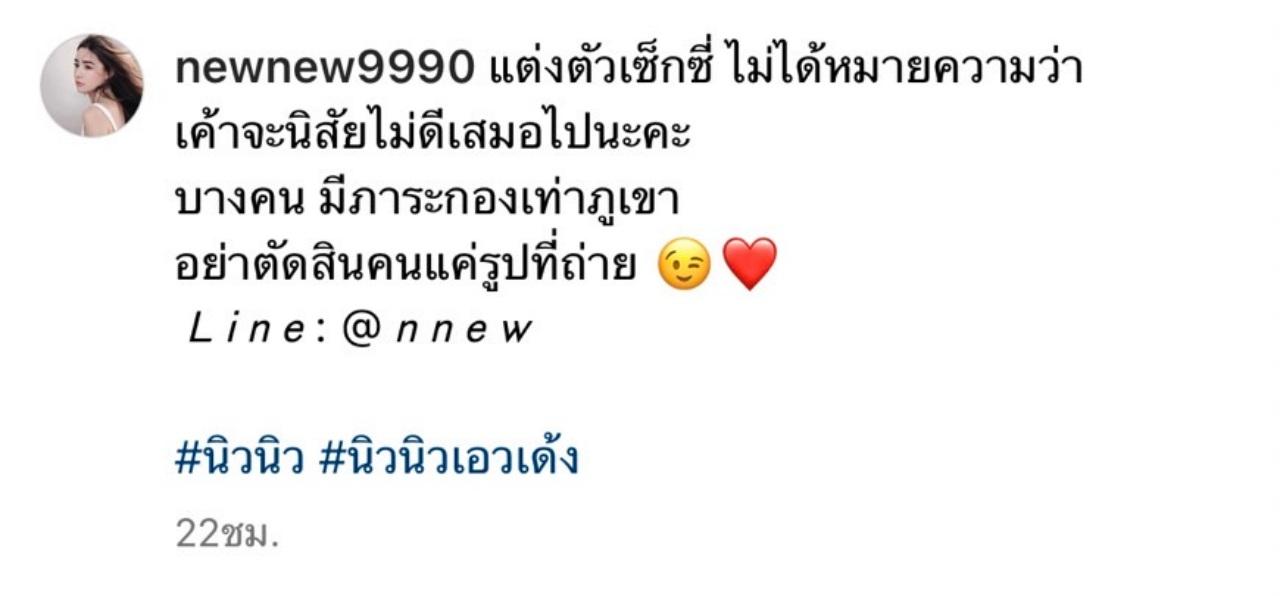 และล่าสุดนิวนิวได้ลงภาพตัวเองในชุดเสื้อแขนยาว สวมกางเกงชั้นในแบบบิกินี พร้อมเขียนแคปชั่นว่า "แต่งตัวเซ็กซี่ ไม่ได้หมายความว่า เค้าจะนิสัยไม่ดีเสมอไปนะคะ บางคน มีภาระกองเท่าภูเขา อย่าตัดสินคนแค่รูปที่ถ่าย" หลายคนที่ติดตามต่างก็เข้ามาคอมเมนต์เห็นด้วยกับสิ่งที่นิวนิวโพสต์จำนวนมาก.