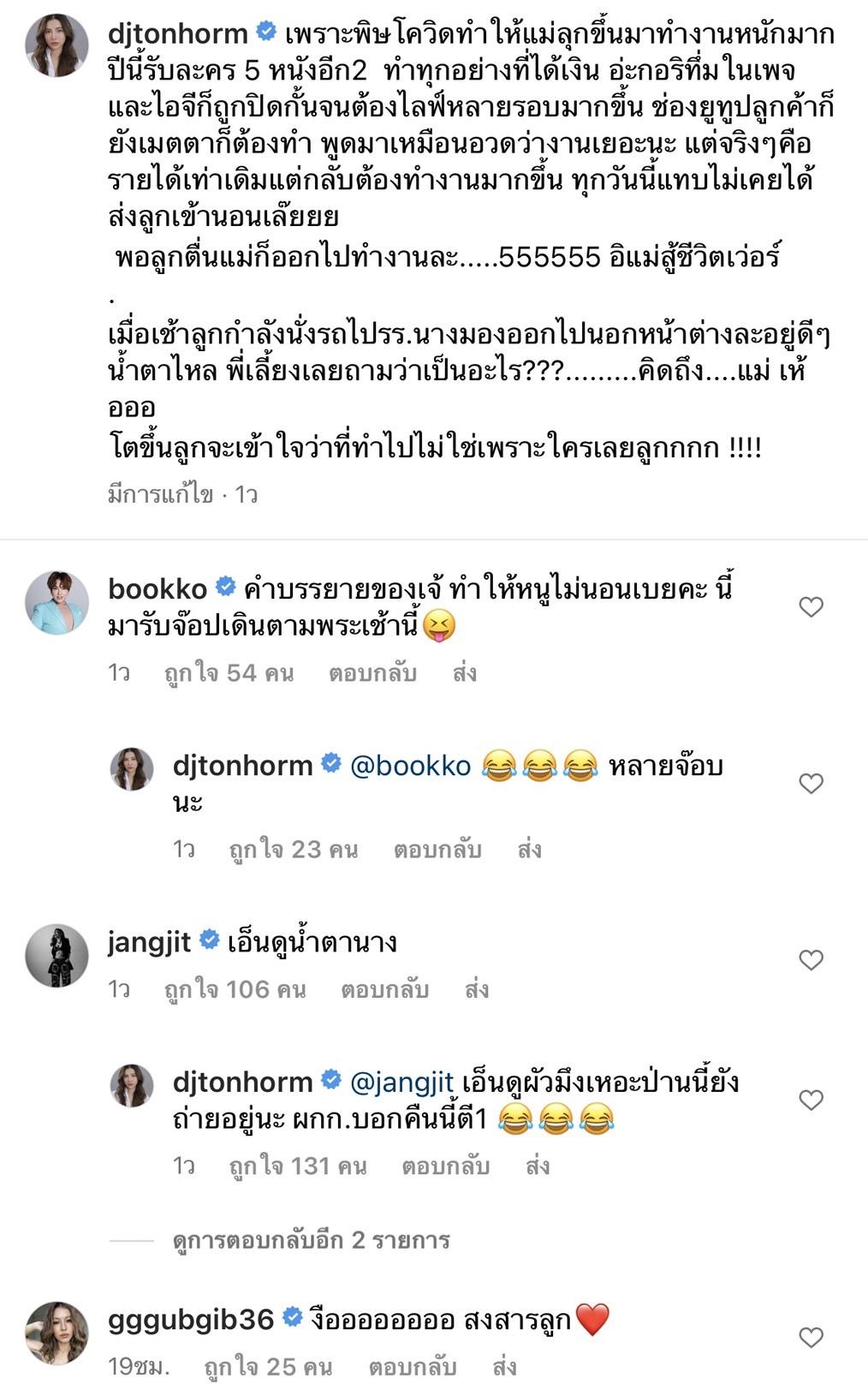 ซึ่ง ดีเจต้นหอม ได้เขียนแคปชั่นเอาไว้ว่า "เพราะพิษโควิดทำให้แม่ลุกขึ้นมาทำงานหนักมาก ปีนี้รับละคร 5 หนังอีก 2 ทำทุกอย่างที่ได้เงิน อัลกอริทึ่มในเพจและไอจีก็ถูกปิดกั้นจนต้องไลฟ์หลายรอบมากขึ้น ช่องยูทูบลูกค้าก็ยังเมตตา ก็ต้องทำ