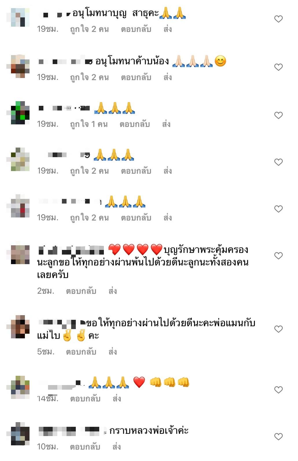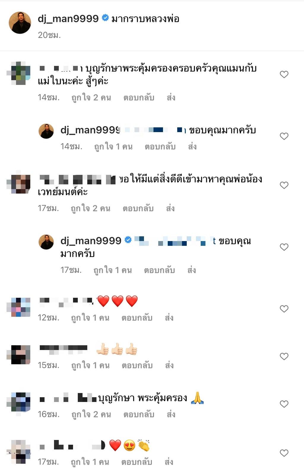 งานนี้เหล่าบรรดาแฟนคลับต่างก็เข้ามาคอมเมนต์อนุโมทนาบุญกับดีเจเมน พร้อมเขียนคำอวยพรต่างๆ ว่า "บุญรักษาพระคุ้มครองครอบครัวคุณแมนกับแม่ใบนะคะ สู้ๆค่ะ, ขอให้มีแต่สิ่งดีดีเข้ามาหาคุณพ่อน้องเวทย์มนต์ค่ะ, อนุโมทนาบุญ สาธุค่ะ, ขอให้ทุกอย่างผ่านไปด้วยดีนะคะพ่อแมนกับแม่ใบ".