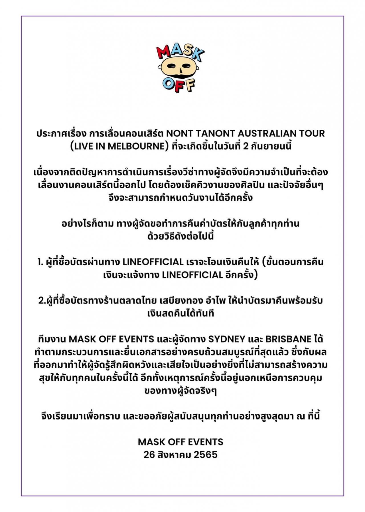 "ประกาศเรื่อง การเลื่อนคอนเสิร์ต NONT TANONT AUSTRALIAN TOUR (LIVE IN MELBOURNE) ที่จะเกิดขึ้นในวันที่ 2 กันยายนนี้ เนื่องจากติดปัญหาการดำเนินการเรื่องวีซ่า ทางผู้จัดจึงมีความจำเป็นที่จะต้องเลื่อนงานคอนเสิร์ตนี้ออกไป โดยต้องเช็กคิวงานของศิลปิน และปัจจัยอื่นๆ จึงจะสามารถกำหนดวันงานได้อีกครั้ง อย่างไรก็ตาม ทางผู้จัดขอทำการคืนค่าบัตรให้กับลูกค้าทุกท่าน ด้วยวิธีดังต่อไปนี้
