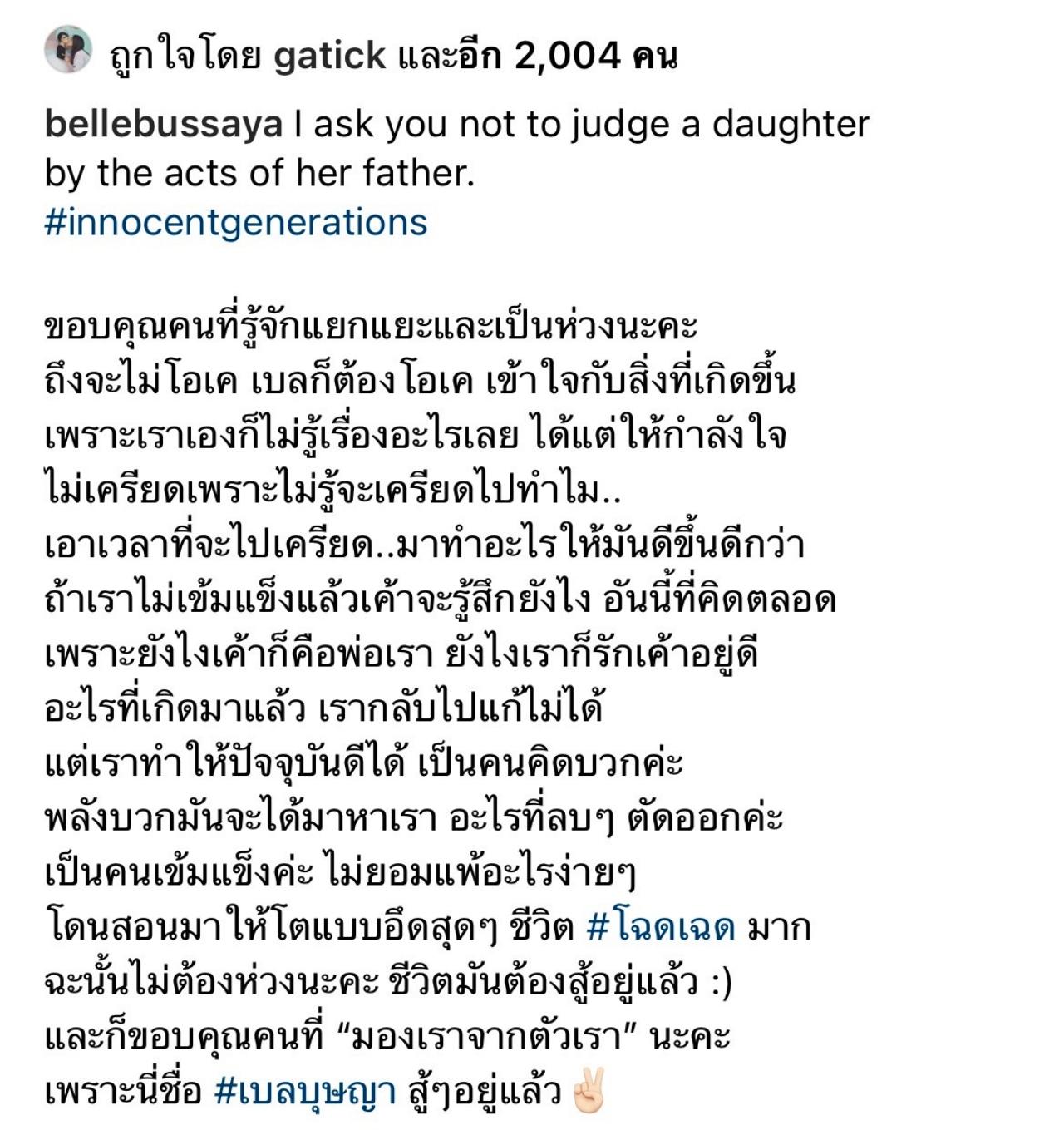 ล่าสุด เบล บุษญา ตั้งภากรณ์ ลูกสาวของนายบรรยิน ก็ได้เคลื่อนไหวผ่านทางอินสตาแกรมของตัวเอง โดยการโพสต์ข้อความว่า "I ask you not to judge a daughter by the acts of her father. #innocentgenerations