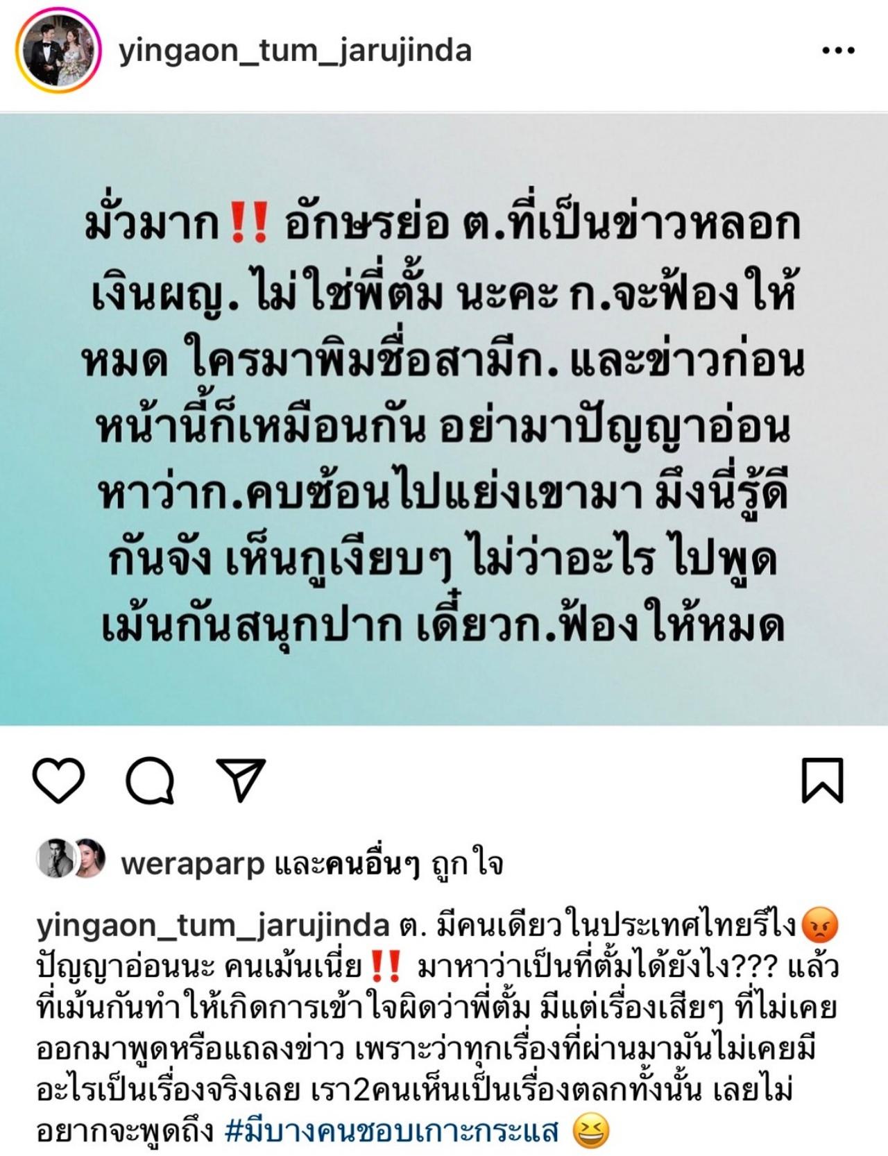 "มั่วมาก!! อักษรย่อ ต.ที่เป็นข่าวหลอกเงิน ผญ. ไม่ใช่พี่ตั้มนะคะ ก.จะฟ้องให้หมด ใครมาพิมชื่อสามี ก. และข่าวก่อนหน้านี้ก็เหมือนกัน อย่ามาปัญญาอ่อนหาว่า ก.คบซ้อนไปแย่งเขามา Xึงนี่รู้ดีกันจัง เห็นXูเงียบๆ ไม่ว่าอะไร ไปพูดเม้นกันสนุกปาก เดี๋ยว ก.ฟ้องให้หมด"