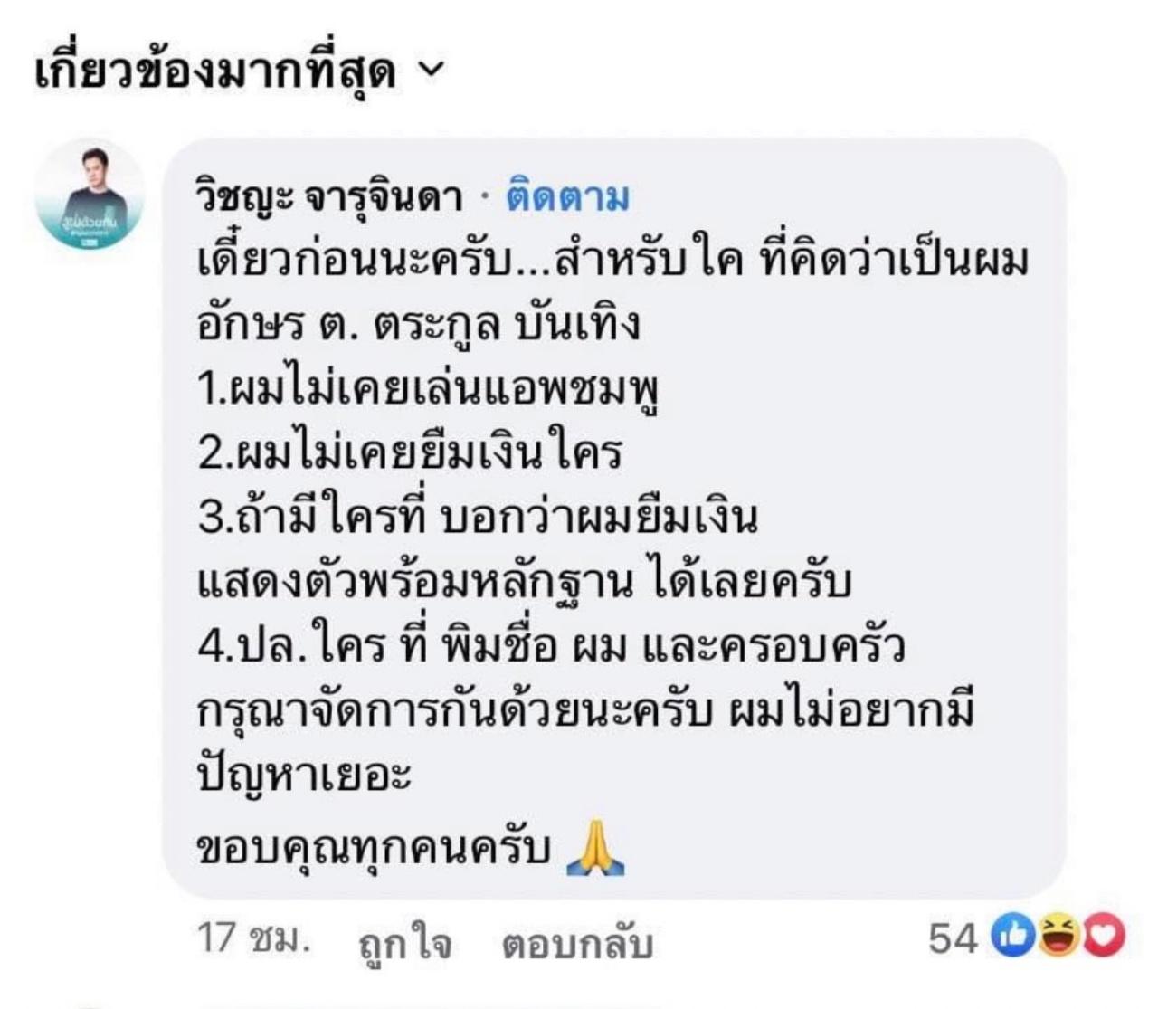 หลังจากที่ถูกพาดพิงถึง ล่าสุด ตั้ม วิชญะ ก็ได้ออกมาคอมเมนต์ยืนยันว่าไม่ใช่ตัวเองในเพจดังกล่าวอีกด้วยว่า “เดี๋ยวก่อนนะครับ…สำหรับใคร ที่คิดว่าเป็นผม อักษร ต. ตระกูล บันเทิง