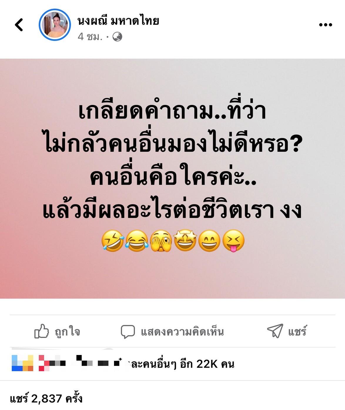 อย่างล่าสุดสาว จ๊ะ ก็ได้โพสต์แคปชั่นลงเฟซบุ๊กส่วนตัว โดยเจ้าตัวได้ระบุข้อความสั้นๆ อย่างกระชับได้ใจความว่า "เกลียดคำถาม..ที่ว่าไม่กลัวคนอื่นมองไม่ดีหรอ? คนอื่นคือใครค่ะ..แล้วมีผลอะไรต่อชีวิตเรา งง" งานนี้ทำเอาถูกอกถูกใจเหล่าบรรดาแฟนคลับยกใหญ่ แห่กันมาถล่มไลค์พร้อมคอมเมนต์กันอย่างล้นหลาม แต่ละข้อความคือไม่ธรรมดา ไม่ว่าจะเป็น