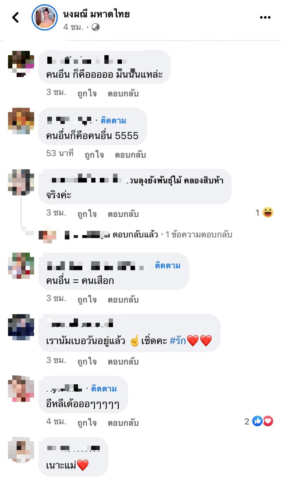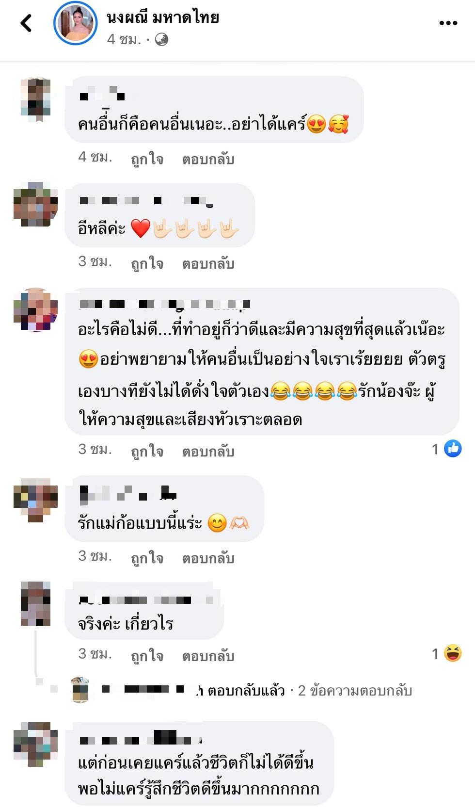 "คนอื่นก็คือคนอื่น, คนอื่น=เสือก, คนอื่นคือคนอื่น อย่าได้แคร์, อะไรคือไม่ดี...ที่ทำอยู่ก็ว่าดีและมีความสุขที่สุดแล้วเนอะ อย่าพยายามให้คนอื่นเป็นอย่างใจเราเลย ตัวเองบางทียังไม่ได้ดั่งใจตัวเอง, รักน้องจ๊ะ ผู้ให้ความสุขและเสียงหัวเราะตลอด, แต่ก่อนเคยแคร์แล้วชีวิตก็ไม่ได้ดีขึ้น พอไม่แคร์รู้สึกชีวิตดีขึ้นมาก" เป็นต้น.