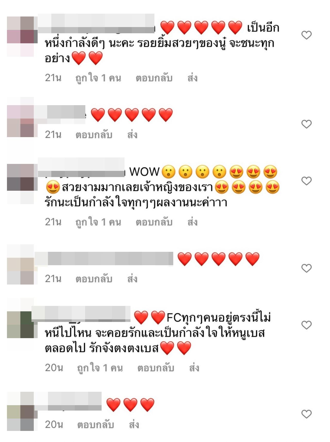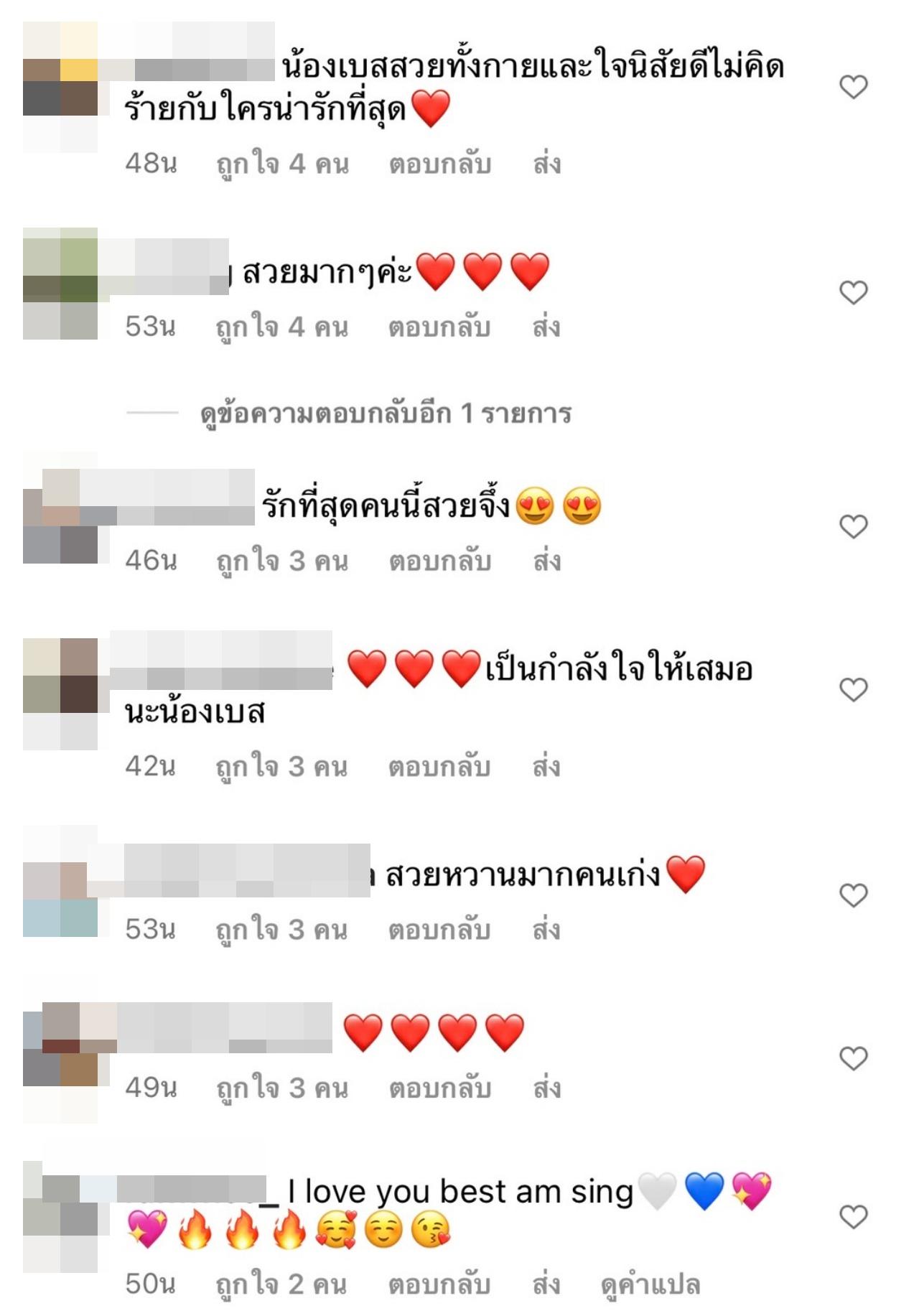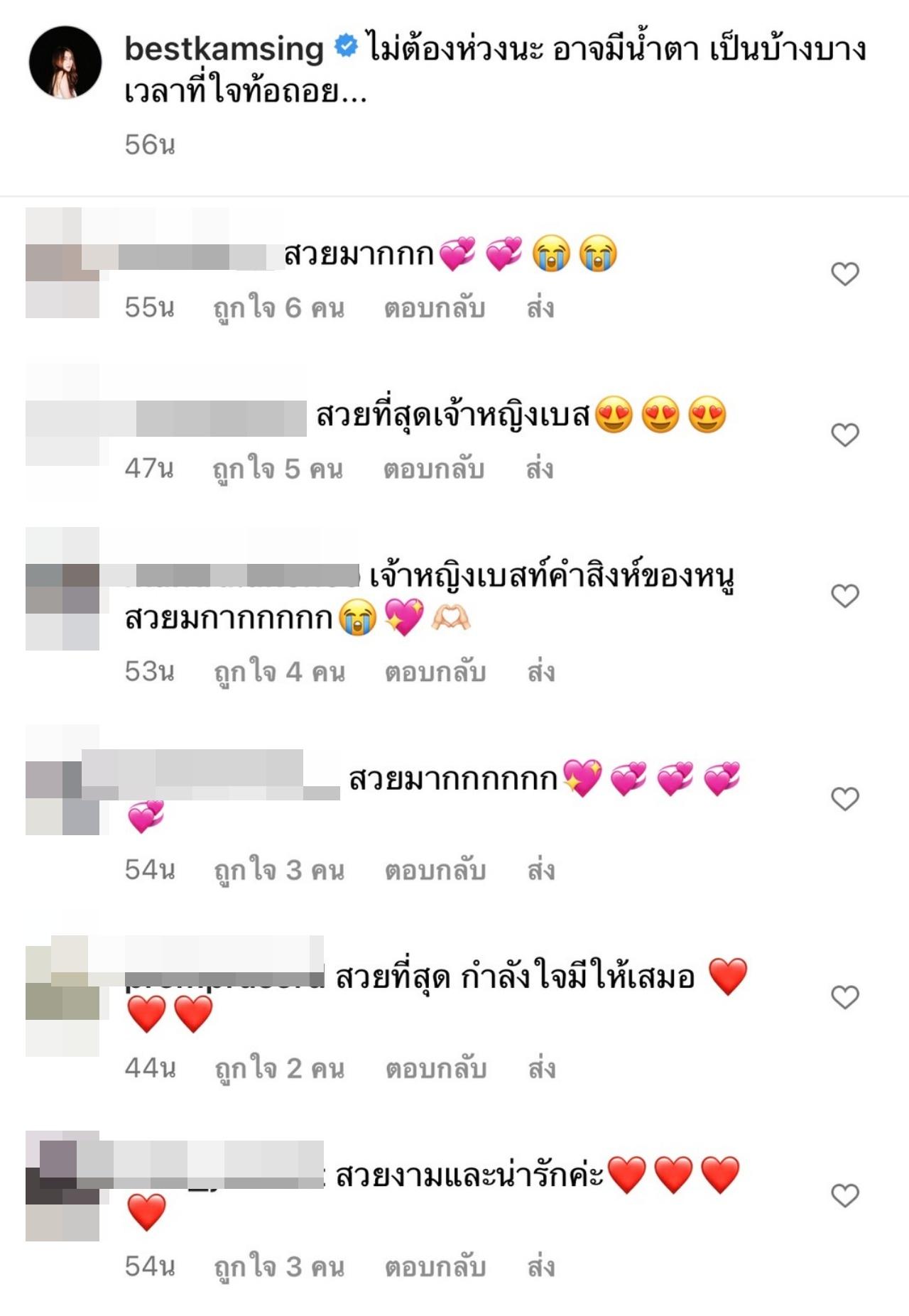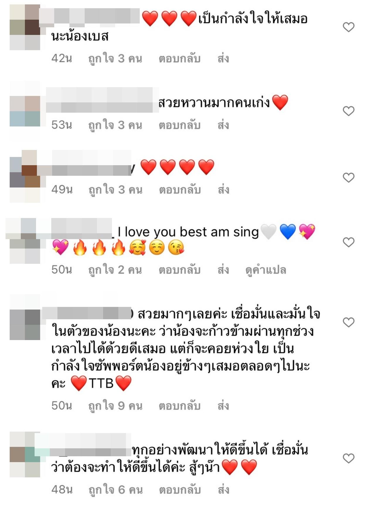 หลังจากที่ เบสท์ โพสต์ข้อความดังกล่าวไป ก็มีแฟนๆ เข้ามาคอมเมนต์ให้กำลังใจนางเอกและยูทูบเบอร์สาวชื่อดังอย่างล้นหลาม อาทิ "น้องเบสสวยทั้งกายและใจ นิสัยดีไม่คิดร้ายกับใครน่ารักที่สุด, เป็นกำลังใจให้เสมอนะน้องเบส, สวยมากๆ เลยค่ะ เชื่อมั่นและมั่นใจในตัวของน้องนะคะ ว่าร้องจะก้าวข้ามผ่านทุกช่วงเวลาไปได้ด้วยดีเสมอ แต่ก็จะคอยหวงใย เป็นกำลังใจ ซัพพอร์ตน้องอยู่ข้างๆ เสมอ ตลอดๆ ไปนะคะ"