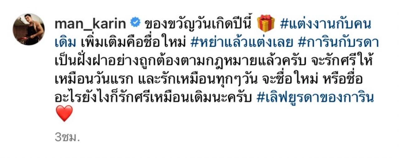 "ของขวัญวันเกิดปีนี้ #แต่งงานกับคนเดิม เพิ่มเติมคือชื่อใหม่ #หย่าแล้วแต่งเลย #การินกับรดา เป็นฝั่งฝาอย่างถูกต้องตามกฎหมายแล้วครับ จะรักศรีให้เหมือนวันแรก และรักเหมือนทุกๆวัน จะชื่อใหม่ หรือชื่ออะไรยังไงก็รักศรีเหมือนเดิมนะครับ #เลิฟยูรดาของการิน"