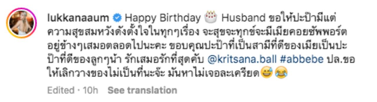 โดย อุ้ม ลักขณา โพสต์ข้อความแฮปปี้เบิร์ธเดย์เดย์สามีว่า "Happy Birthday Husband ขอให้ปะป๊ามีแต่ความสุขสมหวังดังตั้งใจในทุกๆเรื่อง จะสุขจะทุกข์จะมีเมียคอยซัพพอร์ตอยู่ข้างๆเสมอตลอดไปนะคะ ขอบคุณปะป๊าที่เป็นสามีที่ดีของเมียเป็นปะป๊าที่ดีของลูกๆน้า รักเสมอรักที่สุดคับ @kritsana.ball #abbebe ปล.ขอให้เลิกวางของไม่เป็นที่นะจ๊ะ มันหาไม่เจอละเครียด" พร้อมโพสต์ภาพขณะที่ทั้งคู่ขณะอยู่ในอ่างที่มีบับเบิลฟองฟูฟ่อง ในชุดบิกินีและอิริยาบถแซ่บกับสามี.