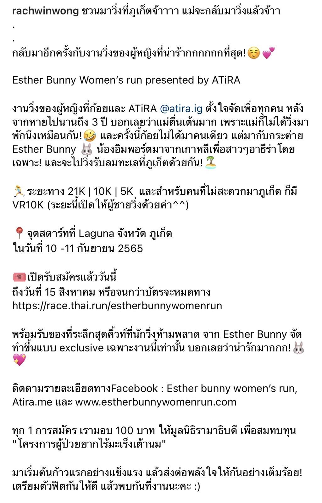 "งานวิ่งของผู้หญิงที่ก้อยและ ATiRA @atira.ig ตั้งใจจัดเพื่อทุกคน หลังจากหายไปนานถึง 3 ปี บอกเลยว่าแม่ตื่นเต้นมาก เพราะแม่ก็ไม่ได้วิ่งมาพักนึงเหมือนกัน! และครั้งนี้ก้อยไม่ได้มาคนเดียว แต่มากับกระต่าย Esther Bunny น้องอิมพอร์ตมาจากเกาหลีเพื่อสาวๆ อาธีร่าโดยเฉพาะ! และจะไปวิ่งรับลมทะเลที่ภูเก็ตด้วยกัน