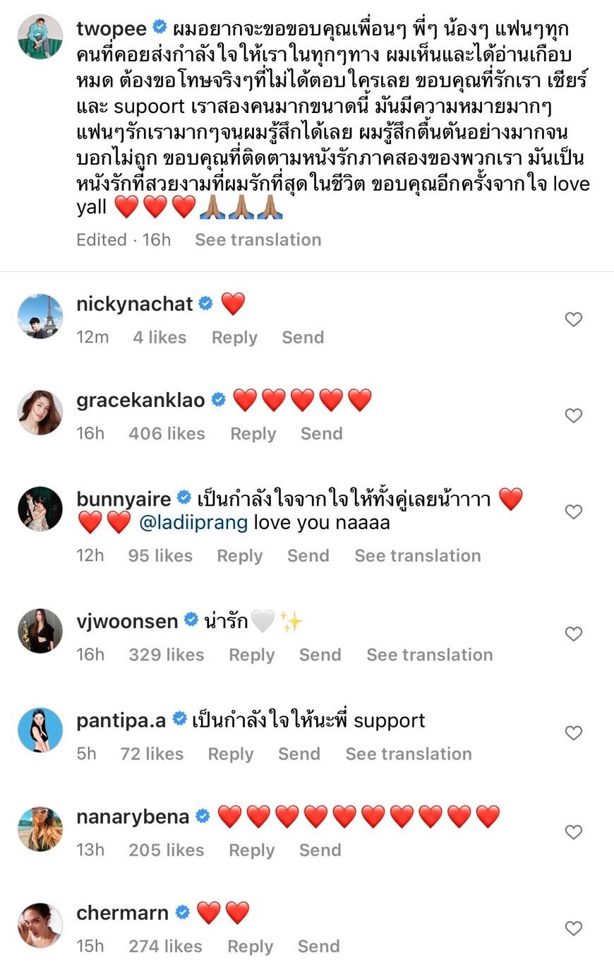 ก่อนที่ โต้ง ทูพี จะโพสต์เปิดใจครั้งแรกถึงเรื่องความรักกับอดีตแฟนสาว พร้อมทั้งแท็กไปที่ไอจีของปราง และเขียนข้อความว่า “ผมอยากจะขอขอบคุณเพื่อนๆ พี่ๆ น้องๆ แฟนๆ ทุกคนที่คอยส่งกำลังใจให้เราในทุกๆ ทาง ผมเห็นและได้อ่านเกือบหมด ต้องขอโทษจริงๆ ที่ไม่ได้ตอบใครเลย ขอบคุณที่รักเรา เชียร์ และ support เราสองคนมากขนาดนี้ มันมีความหมายมากๆ แฟนๆ รักเรามากๆ จนผมรู้สึกได้เลย ผมรู้สึกตื้นตันอย่างมากจนบอกไม่ถูก ขอบคุณที่ติดตามหนังรักภาคสองของพวกเรา มันเป็นหนังรักที่สวยงามที่ผมรักที่สุดในชีวิต ขอบคุณอีกครั้งจากใจ love yall”