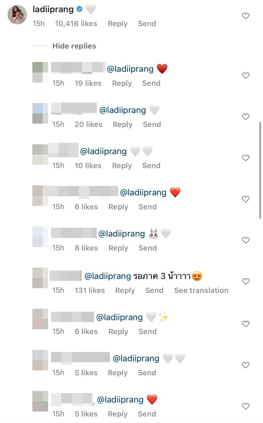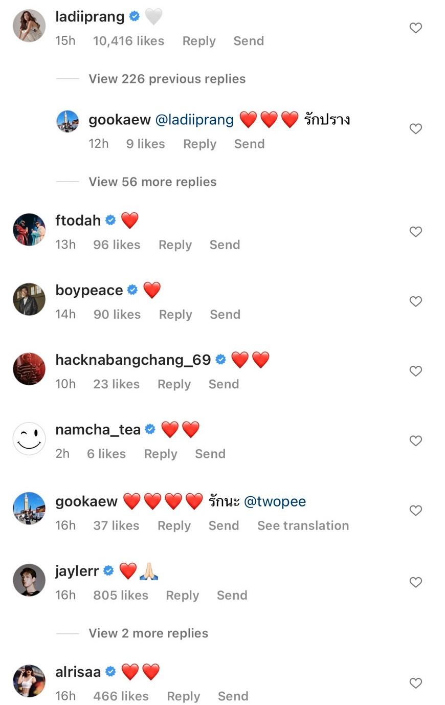 โดยนอกจากจะมีคนในวงการบันเทิงเข้ามาคอมเมนต์ให้กำลังใจนักร้องหนุ่มเต็มไอจีแล้ว ด้านอดีตแฟนสาวอย่างปรางก็ได้เข้ามาคอมเมนต์เป็นอีโมจิหัวใจสีขาว โดยมีแฟนๆ แห่กดไลค์ พร้อมทั้งคอมเมนต์ถึงปรางนับร้อยข้อความ โดยมีทั้งให้กำลังใจและบอกว่ายังรอลุ้นความรักภาค 3 ของทั้งคู่ด้วย.