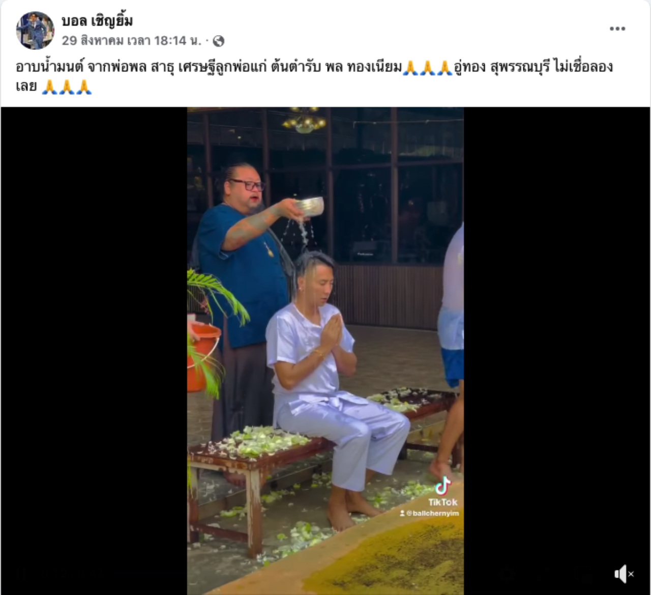 จากนั้นก็ได้โพสต์คลิปที่กำลังอาบน้ำมนต์เพื่อความสบายใจ "อาบน้ำมนต์ จากพ่อพล สาธุ เศรษฐีลูกพ่อแก่ ต้นตำรับ พล ทองเนียม อู่ทอง สุพรรณบุรี ไม่เชื่อลองเลย"