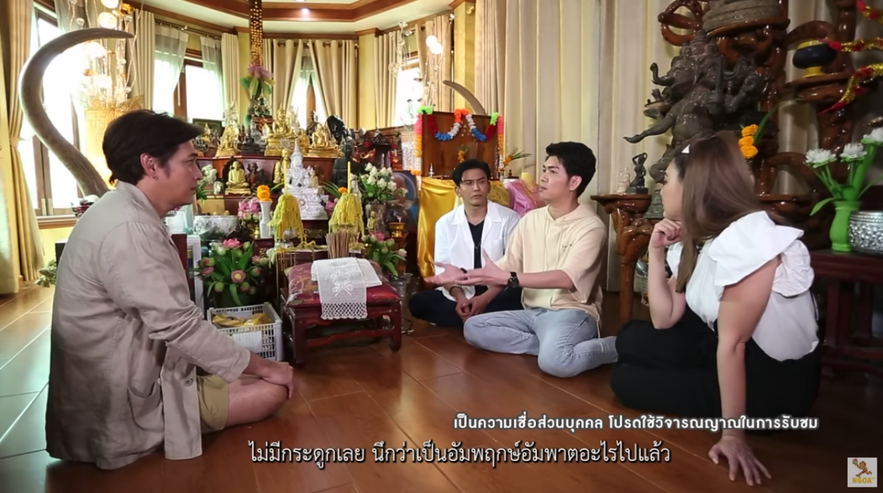 นอกจากนี้ กุ้ง บอกว่า ในห้องพระก็จะมีสิ่งศักดิ์สิทธิ์เยอะมาก ไม่เคยเปิดให้ใครได้มาเห็นเลย แม้กระทั่งลูกน้อง และในห้องนี้ยังมีเสาตกน้ำมัน ซึ่งเป็นเสาไม้จากบ้านหลังเก่าที่ถูกรื้อไป ซึ่งเมื่อก่อนบริเวณนี้เป็นบริเวณวัด ตรงบ้านที่ตั้งอยู่ก็เป็นกองฟอนเก่า (ที่เผาศพของคนสมัยก่อน) ใครก็อยู่ไม่ได้ เพราะที่แรงมาก แต่ตนเองไม่กลัว คนที่อยู่รอบๆ บ้านเคยเห็นผู้หญิงผมยาว ใส่สไบ เดินบนบ้านเวลาที่ไม่มีใครอยู่ คนข้างบ้านเขาเห็น